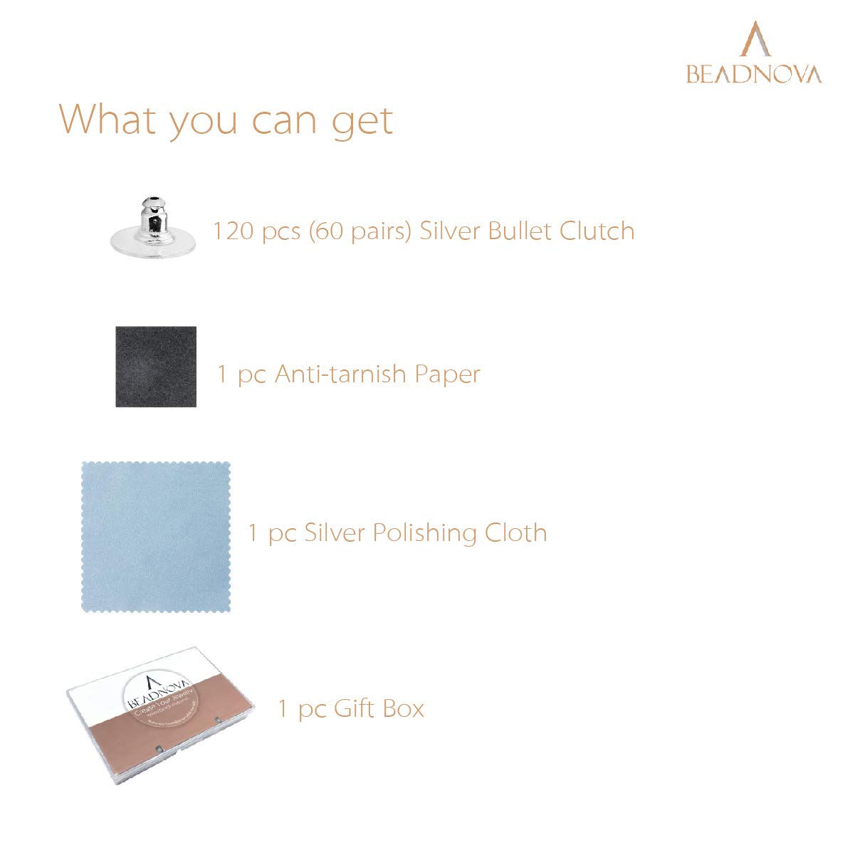 BEADNOVA Earring Backs Replacements Earring Backing Silver Plated Pierced Hypoallergenic Ear Stud Backs Stoppers Safety Bullet Clutch Earstud Backings with Pad for Posts (120pcs)