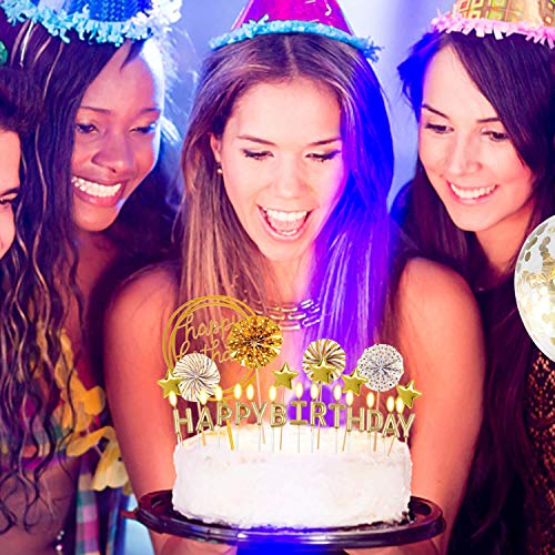 - HIGH-QUALITY MATERIALS: The HAPPY BIRTHDAY cake Topper is made of bright acrylic and cards, balloons are made of latex, star and fan-shaped cake top hats are made of paper, birthday candles are made of high-quality wax, smokeless, non-toxic and tasteless, Harmless and safe to use. These cake top hats can be reused, except for birthday candles.