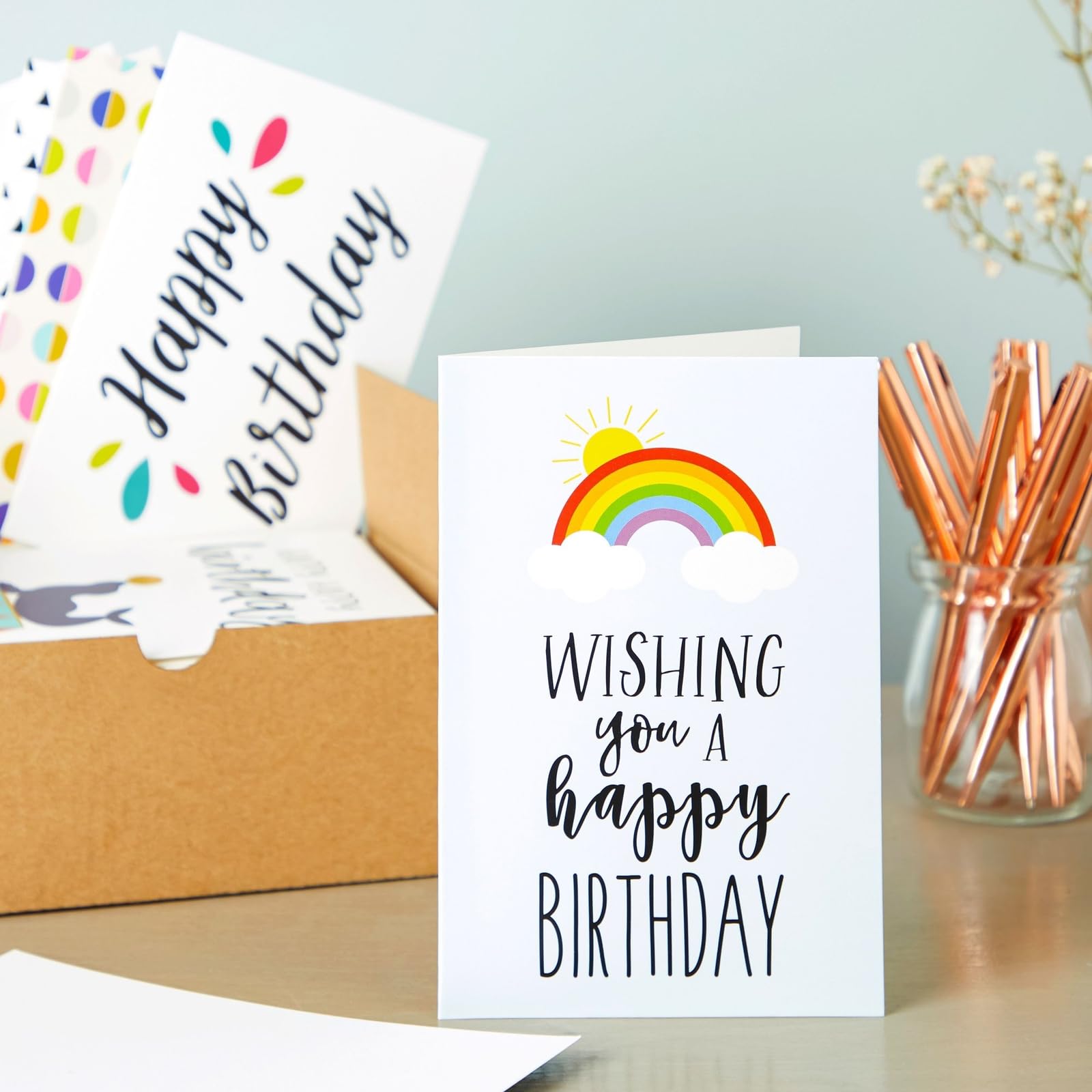 - 48 Cute Designs: Our cards for all occasions in one box set features a wide variety of fun prints such as rainbow, hearts, birthday banners, stars, animals, flowers, and fun phrases and sayings