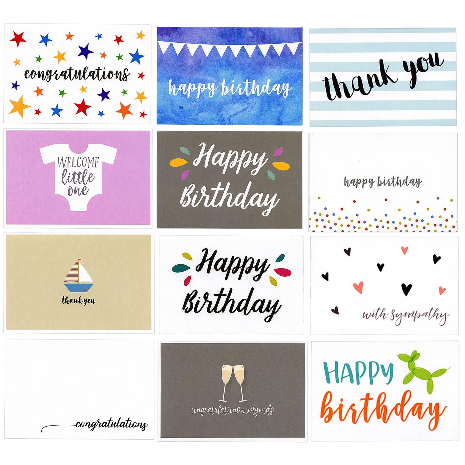 - All Occasion Cards Assortment Box With Envelopes: Features 48 cards; includes 16 birthday, 8 thank you, 6 congratulation, 6 generic, 4 baby shower, 3 sympathy, and 2 wedding cards, with 1 thinking of you card