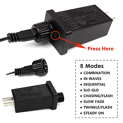 - 👉【8 Lighting Modes Twinkle Lights】8 Functions to fit different occasions, moods, feelings, holidays, festivals, anniversaries, etc. (Combination, In waves, Sequential, Slow Glow, Chasing/Flash, Slow fade, Twinkle/Flash, Steady on). Adjust the lighting modes by pressing the round button on the adapter.