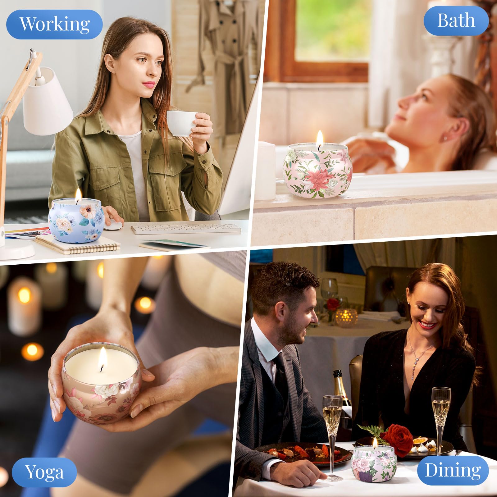 - [4 Different Fragrances] Each set of BlissfulOasis scented candles contains four different scents of scented candles: Lavender, Lemon, Bergamot & Jasmine, and Rose & Sandalwood. You can experience four different experiences