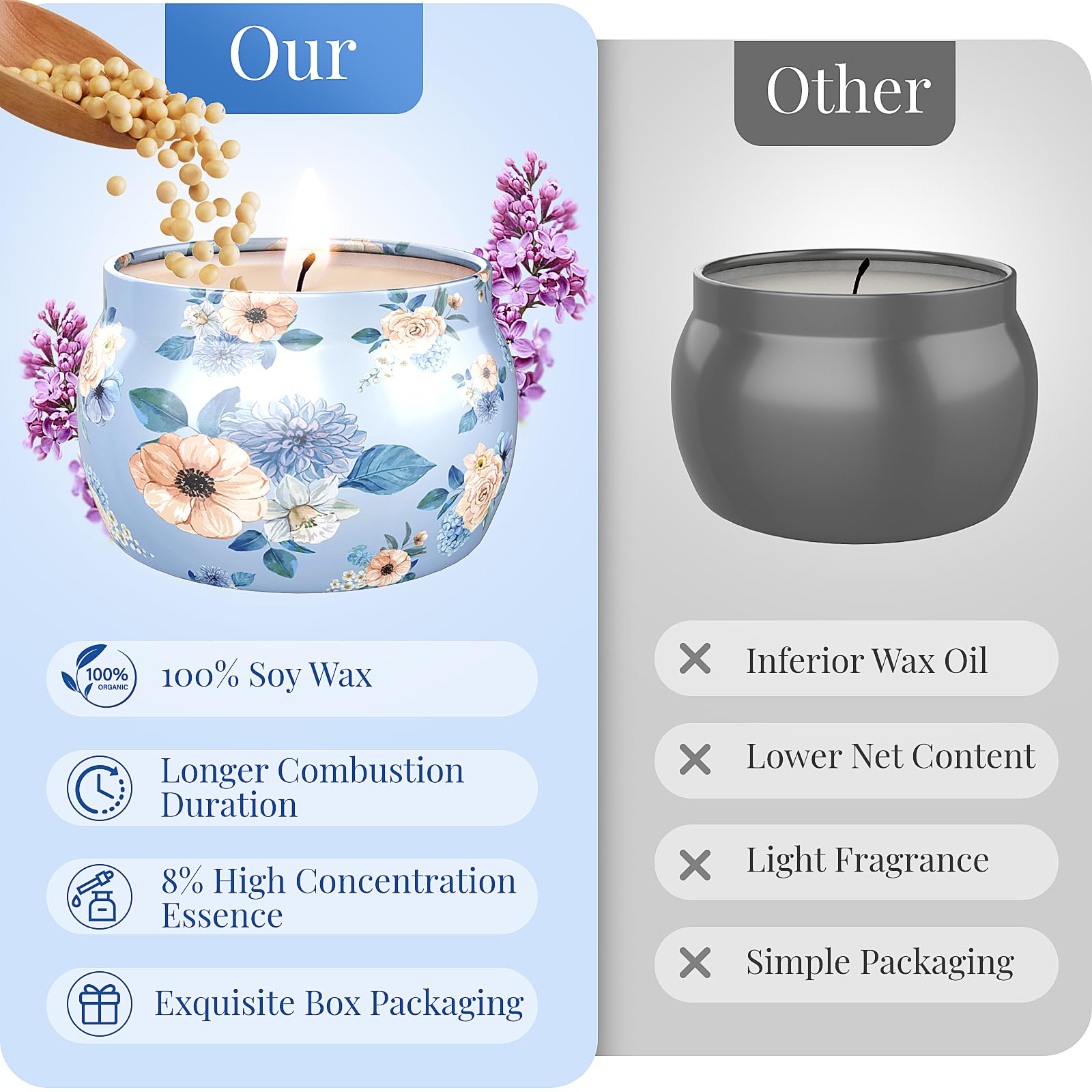 - [High Quality Materials] BlissfulOasis scented candles set is made of high quality materials. Each jar of BlissfulOasis scented candles comes with a lid, which can prevent dust for your unused scented candles. The design with a lid also makes the scented candle more portable, allowing you to enjoy the soothing experience it brings whether you are at home or on the go