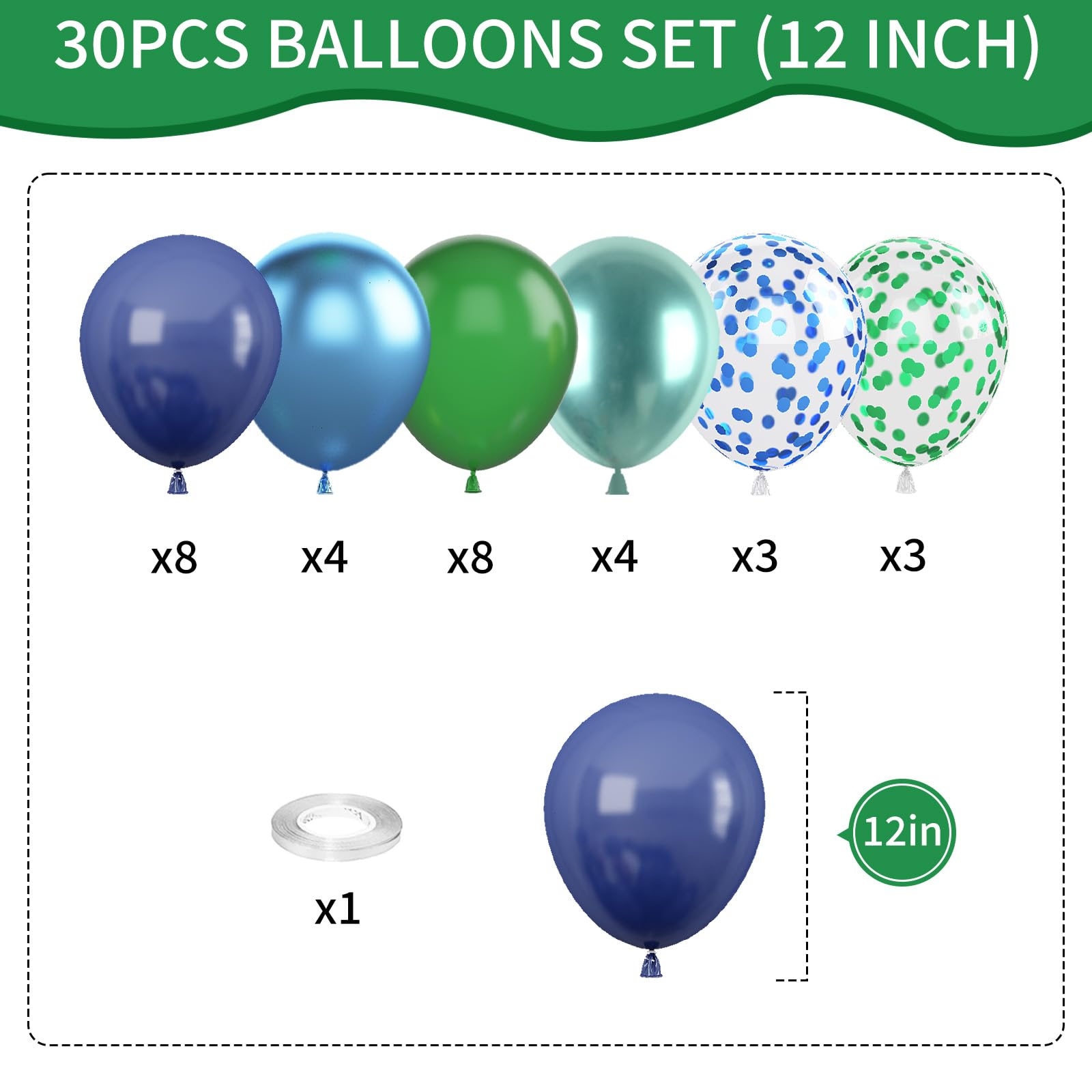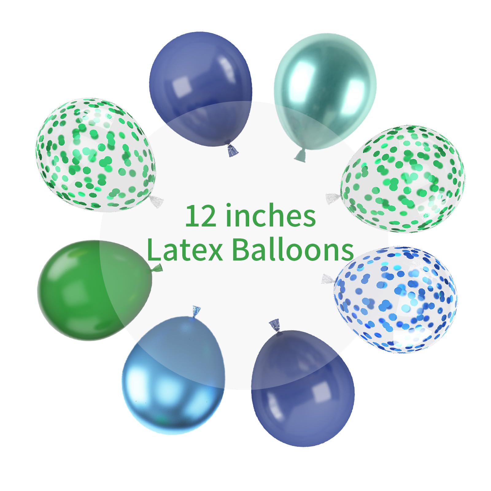 - 12 Inch blue and green balloons: Package content includes 9 pcs green balloons, 2 pcs confetti green Balloons, 4 pcs metallic green balloons, 4 pcs metallic blue balloons,9 pcs blue balloons,2 pcs confetti blue Balloons, a balloon ribbon.