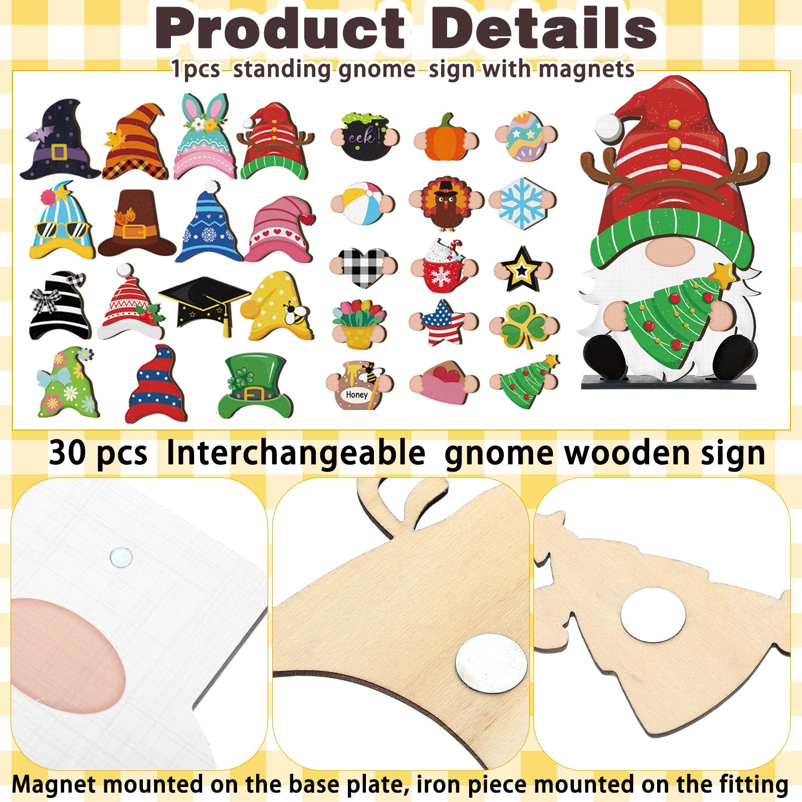 - What You Will Get: you will receive a package coming with 1 piece of freestanding wooden gnome decor along with 30 pieces of interchangeable themed magnet pieces, a total of 15 groups; Each piece measures approximately 18 x 9 cm/ 7.1 x 3.5 inches for your use