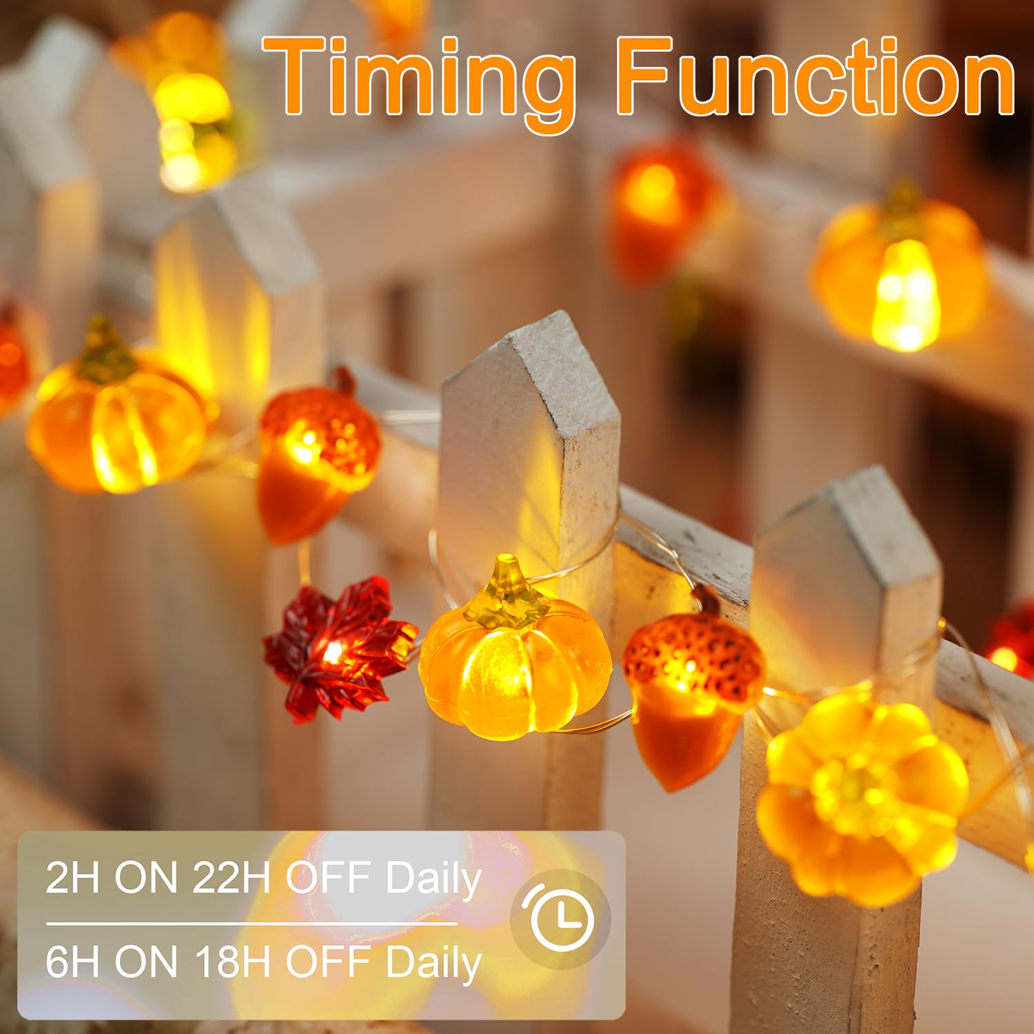 - Timing Function and 12 Lighting Modes: To avoid forgetting to turn off the lights, you can set timer, the string lights will be 2 hours on or 6 hours on per day. Use the remote control or button on the battery box to switch 12 modes, combination, star flash, breathing, twinkle, chasing/flash, slow fade, flash, and steady on. A great choice for Thanksgiving, Christmas, fall and Halloween party decorations.