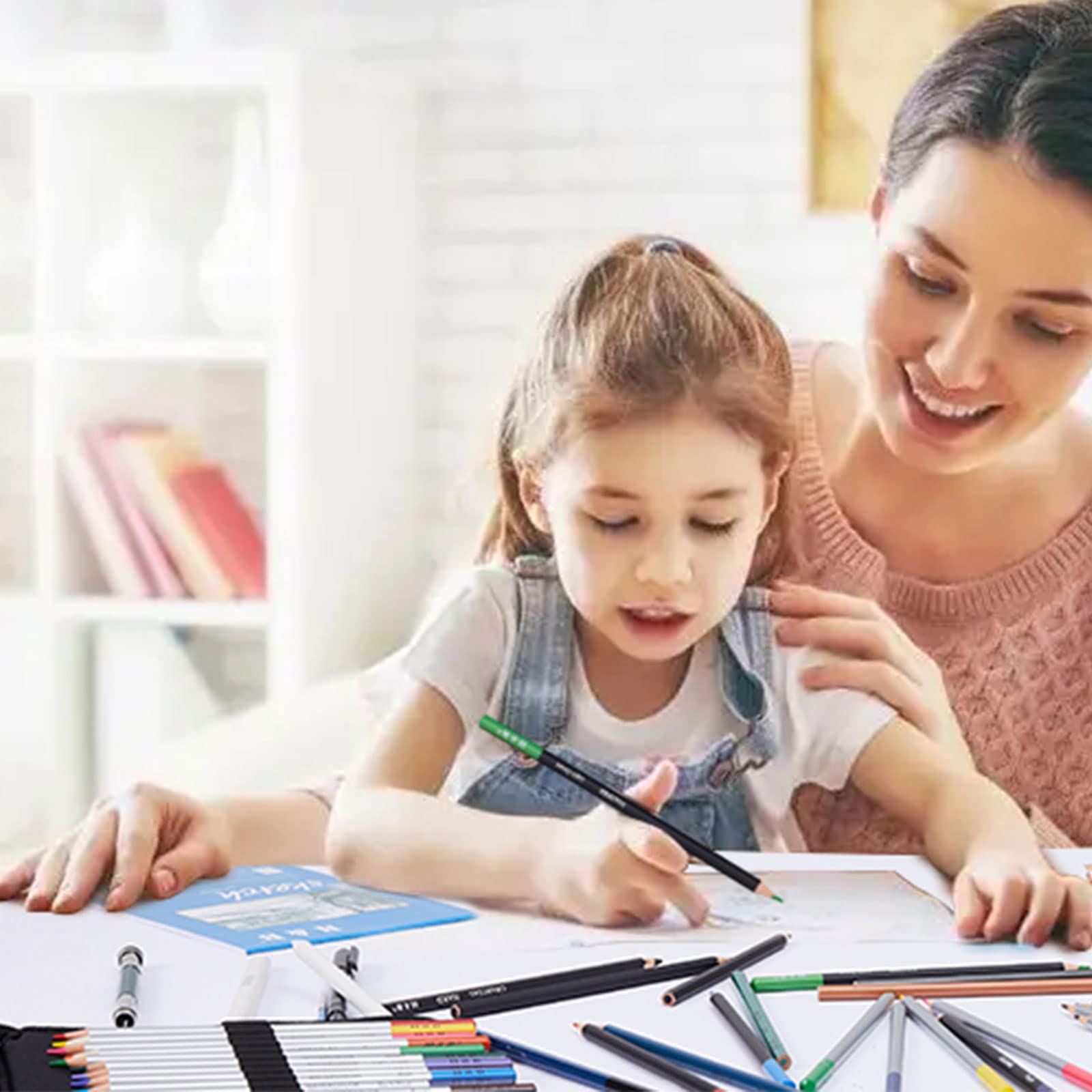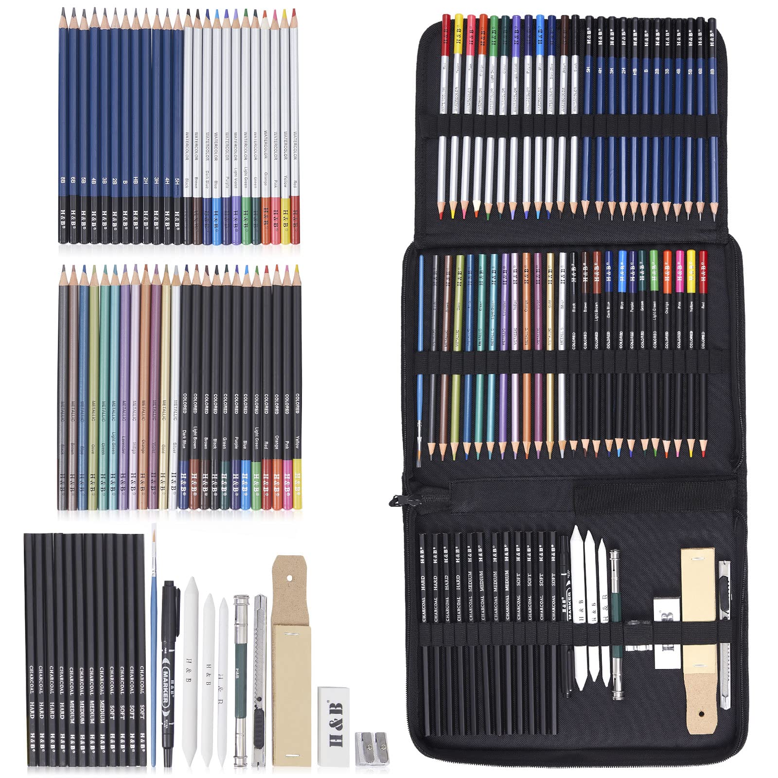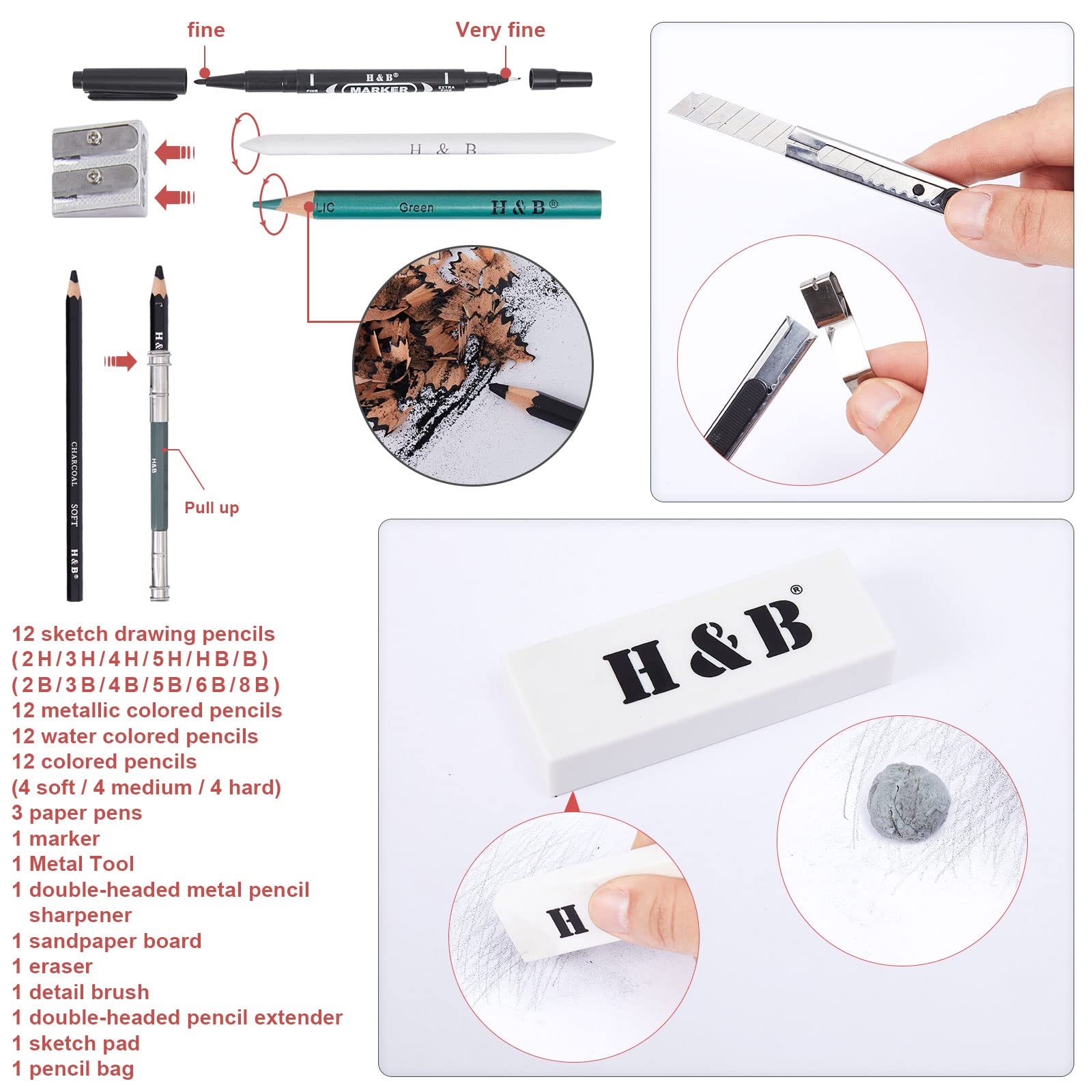 - 🖊️【Wow Professional Drawing Kit】- Comes With 72 Pieces of Art Accessories:12 Sketching Drawing Pencils (2H/3H/4H/5H/HB/B/2B/3B/4B/5B/6B/8B), 12 Metallic Colored Pencils, 12 Watercolor Pencils, 12 Colored Pencils, 12 Charcoal Pencils(4 Soft/4 Medium/4 Hard), 3 Paper Pens, 1 Marker, 1 Metal Tool, 1 Double Hole Metal Pencil Sharpener, 1 Sandpaper Block, 1 eraser, 1 Detail Brush, 1 Double Headed Pencil Extender, 1 A5 sketch pad, 1 Pencil Bag.