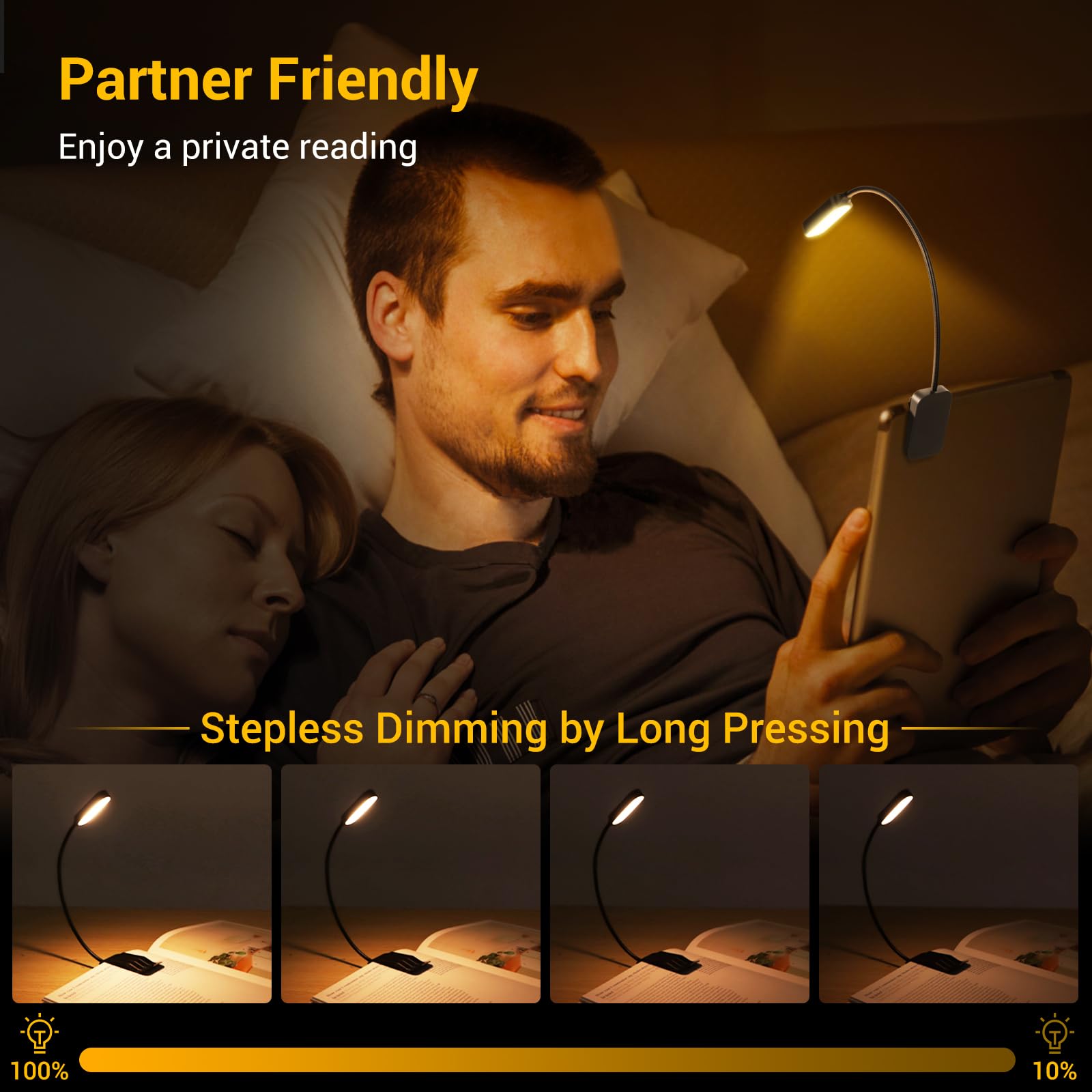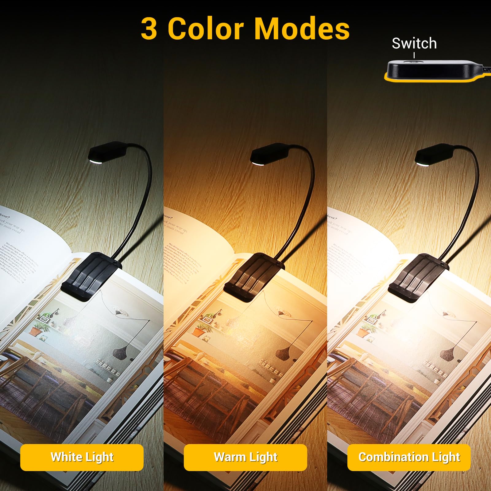 - 【3 Color Modes & Stepless Dimming】- This book reading light has 3 color temperature modes: white light (5 LEDs, 6000k), warm light (4 LEDs, 3000k), and mixed light (9 LEDs, 4500k). Long-press the brightness adjustment button to adjust the brightness from 10% to 100%, which can meet various needs in different reading environments. No flicker, shadow, or glare.
