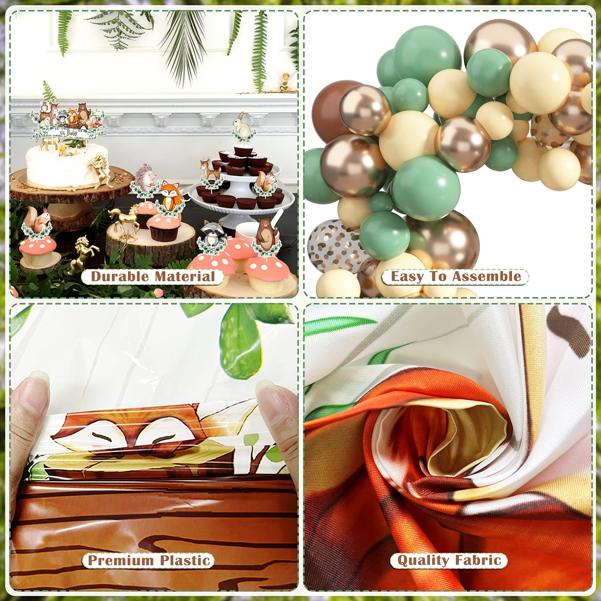 BORAMDO Woodland Animals Baby Shower Decoration Pack Forest Animal Neutral Gender Reveal Party Supplies Woodland Themed Birthday Party Ideas Set 106 Pcs Backdrop, Tablecloth, Cake Toppers, Balloons