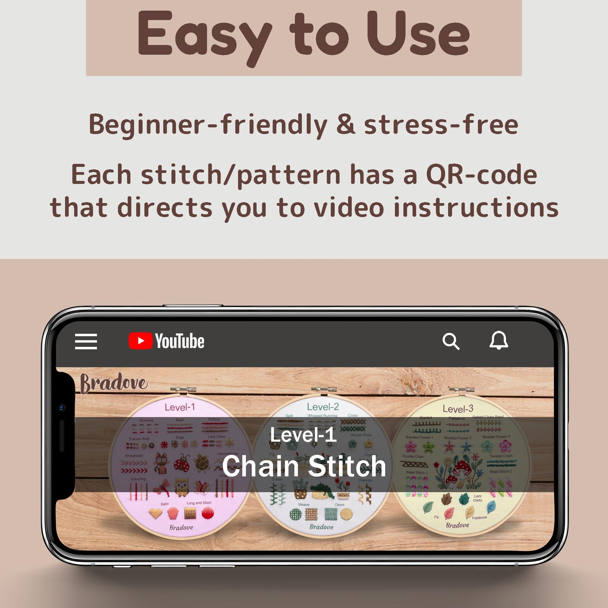Bradove Beginner Embroidery Kit for Adults Kids, Learn to Embroider 37 Stitches and 13 Cute Patterns, Stitches Kit, Bead Embroidery Kit, Beginner Embroidery Practice