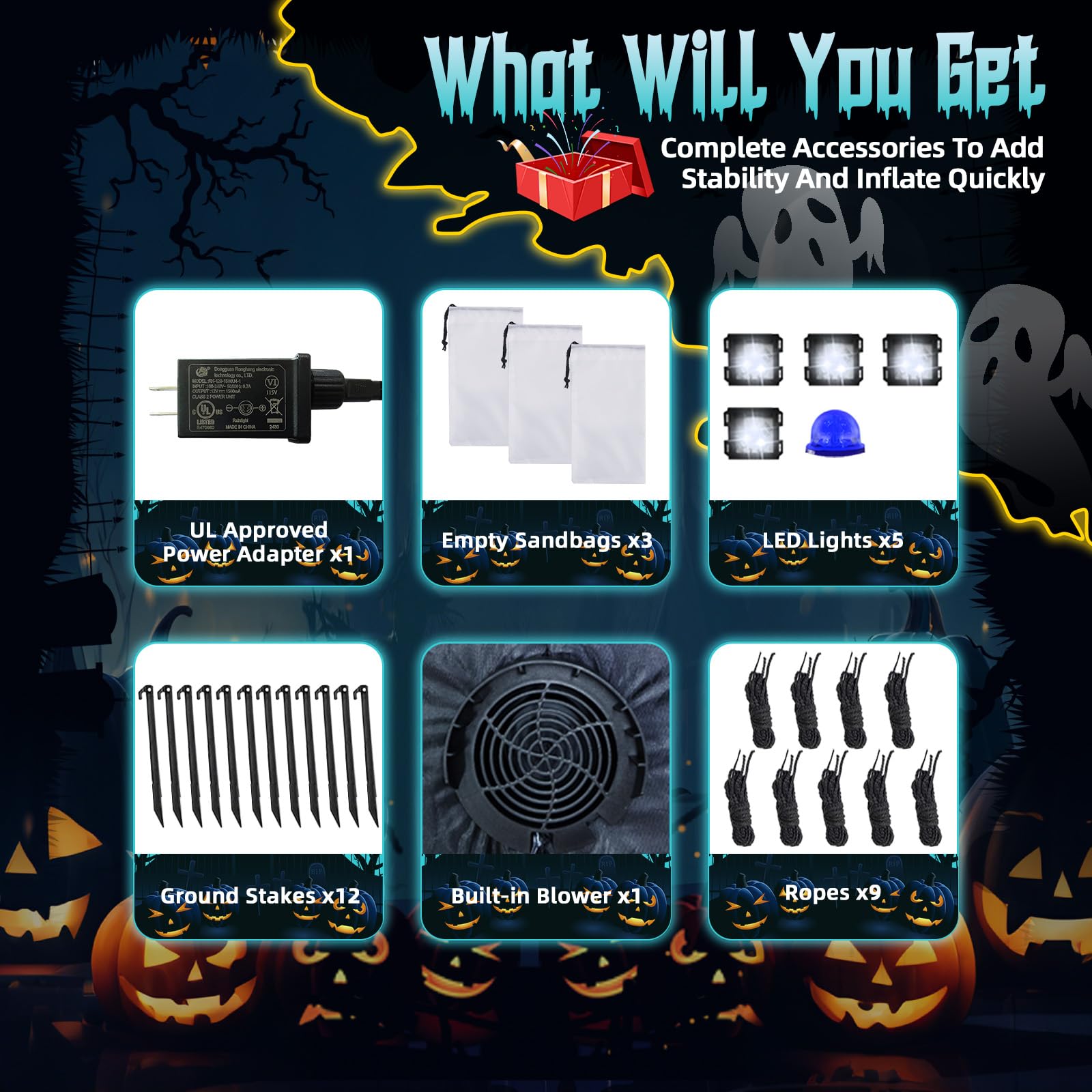 - Triple Stability & Secure Enough: Equipped with UL certified adapter to ensure safe outdoor use. We provide you with 12 ground stakes, 9 ropes and 3 empty sandbags to ensure the Halloween inflatables stay in place throughout the holiday season.