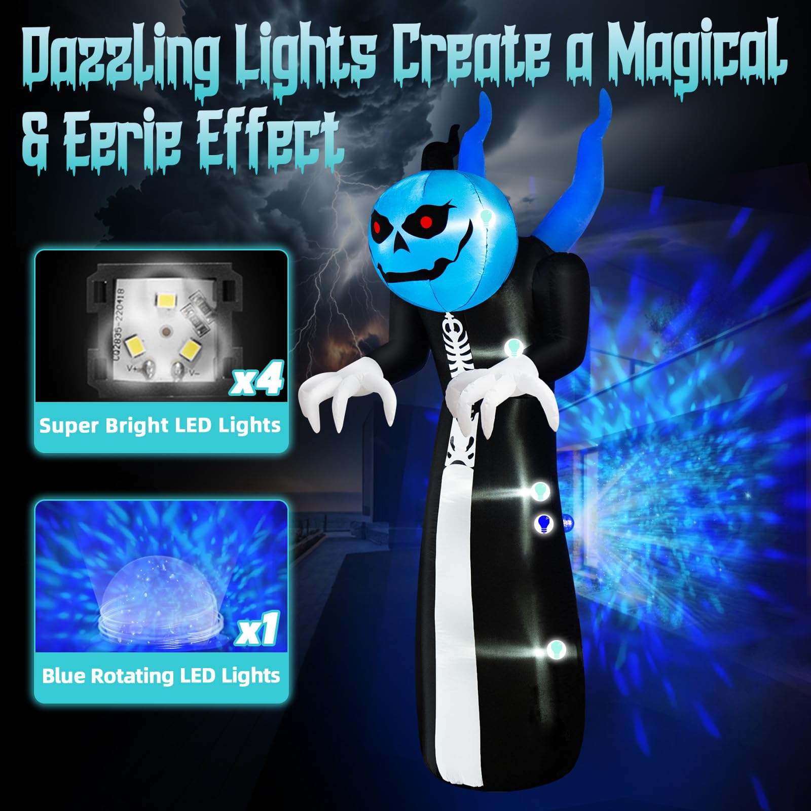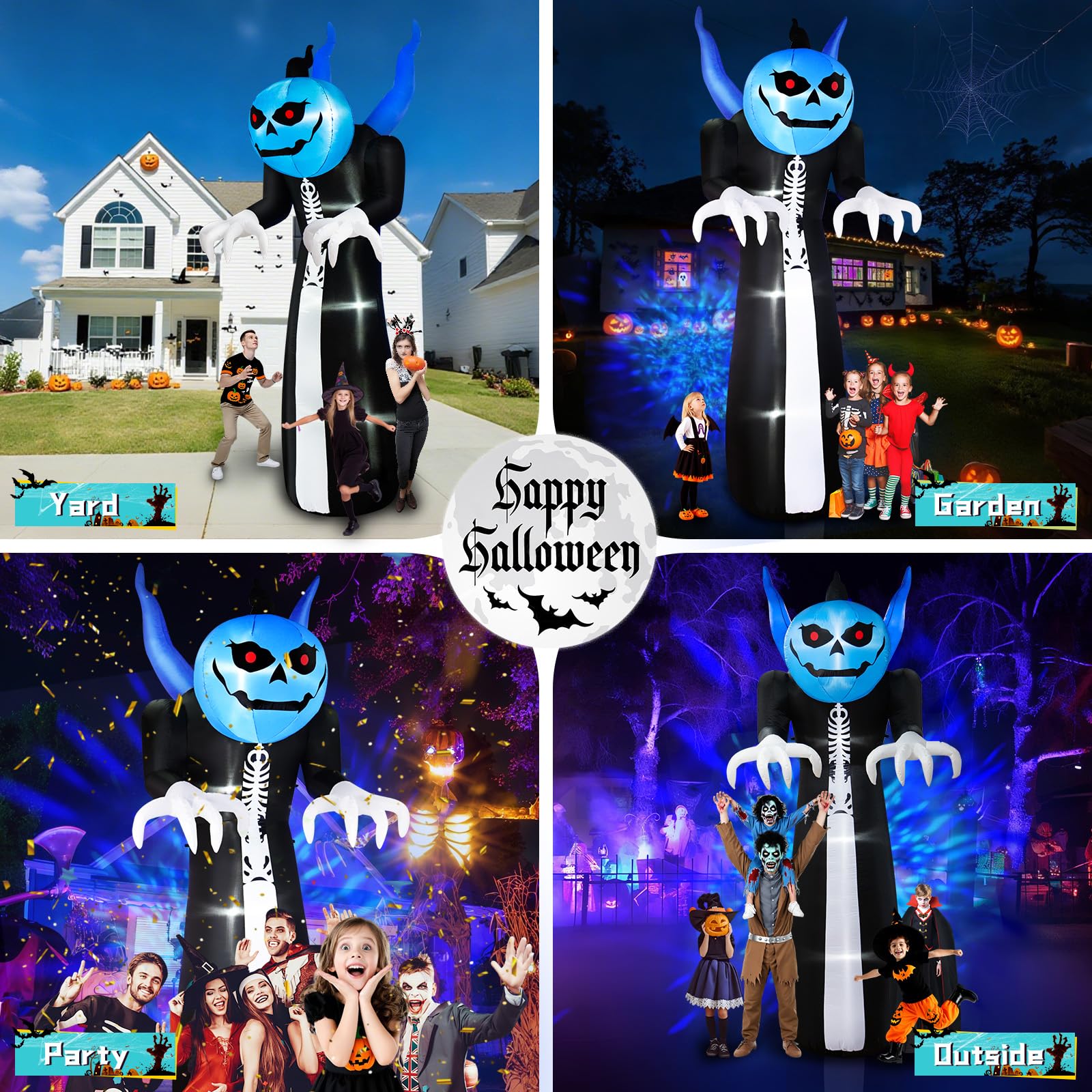 - Scary Halloween Decorations: Turn your yard into a Haunting haven with the 12FT Halloween ghost decorations. The ferocious and tall grim reaper Halloween decorations are stretching its claws in the breeze, ready to take away human souls at any moment! Built-in blue rotating LED light and bright LEDs, this inflatable pumpkin reaper creates a spine-chilling atmosphere by projecting a cool flame onto any nearby wall.