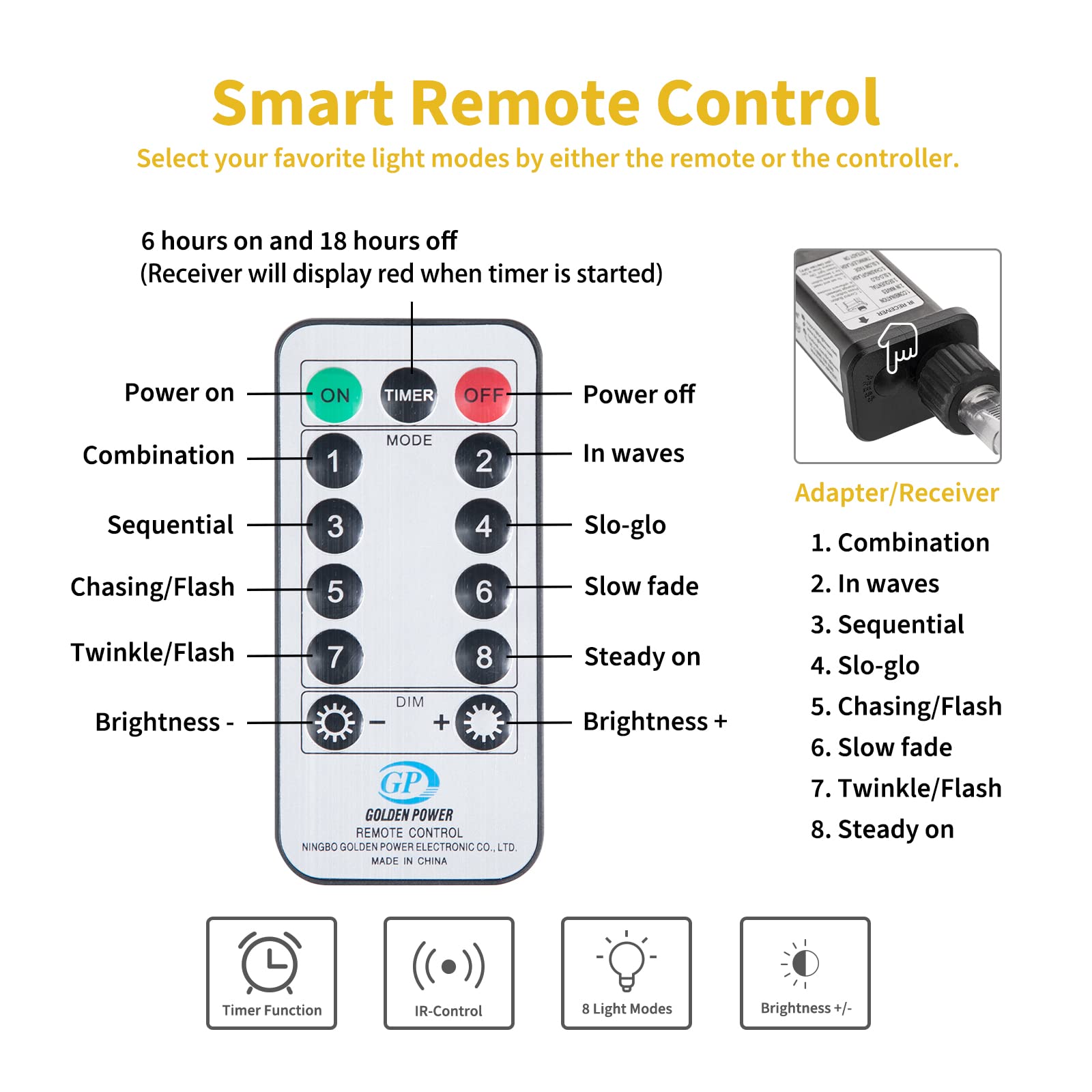 - Modes & Memory Function - The string lights have 8 lighting modes: Combination, in waves, sequential, slogs, chasing, slow fade, twinkle, steady on. With a memory function, the mode that is turned on again after being turned off is that before turning off.