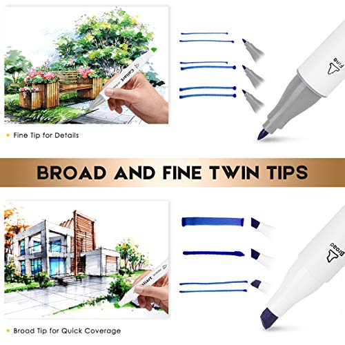 - 🎨 Dual Tips & Round Pen holder - Broad chisel (approx. 1-7mm) and fine point(approx. 0. 7mm) nibs for precise highlighting and underlining. Allowing you to write in both thin and thick lines, providing great versatility. Caliart artist markers are great for providing various styles, sketches and patterns with ease. NOTE: as they are Alcohol Based Markers like ALL other brand alcohol markers, they will Bleed through regular coloring paper, except very thick paper, marker paper.