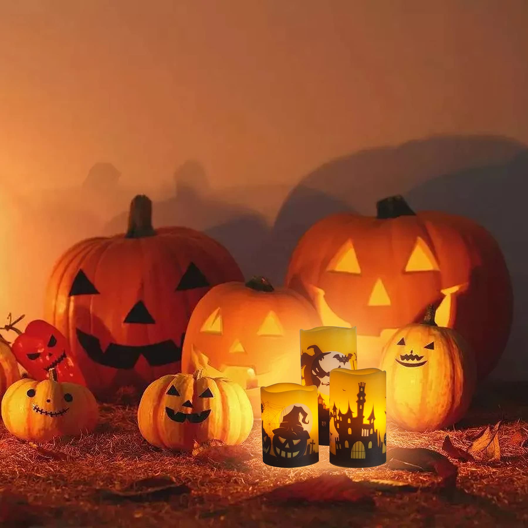 - For Halloween Decorations. The set of three flameless LED candles is designed for Halloween decorations. The decals include pumpkins, witch hat, bats, castle, spider, web, tomb ghost and black cat. All patterns and images are specially designed for the holiday. The battery powered LED candles create holiday atmosphere for Halloween and are great gift choice for both adults and kids.