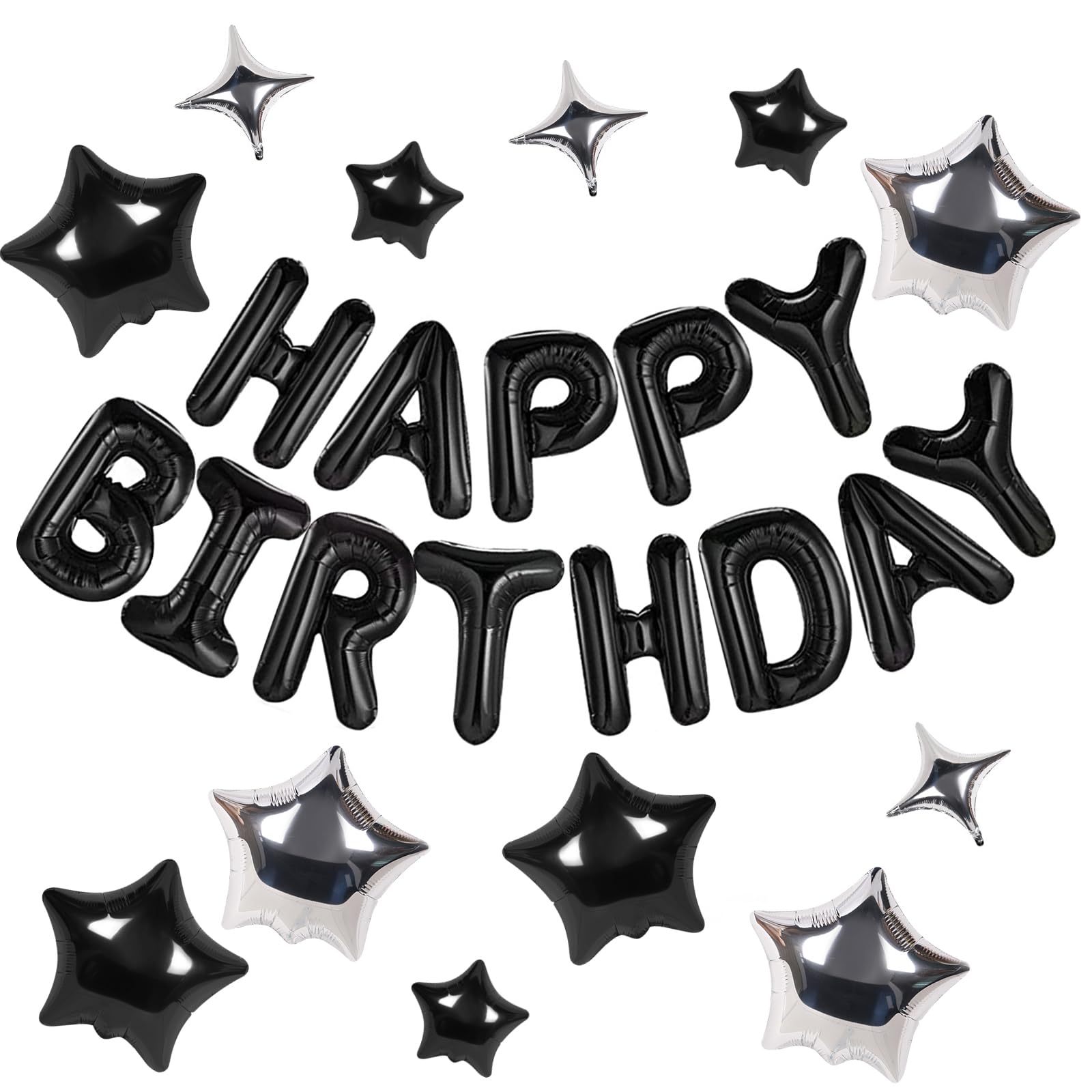 - 🎈VALUABLE PACK : Each package come with ①Black Happy Birthday letters x13pcs(16in) ② Silver four-pointed star x3pcs (10in)③ Black five-pointed star x3pcs (10in) ④ Black five-pointed star x3pcs+Silver five-pointed star x3pcs (18in) ⑤Plastic straw x2pcs ⑥Ribbon x1pcs.