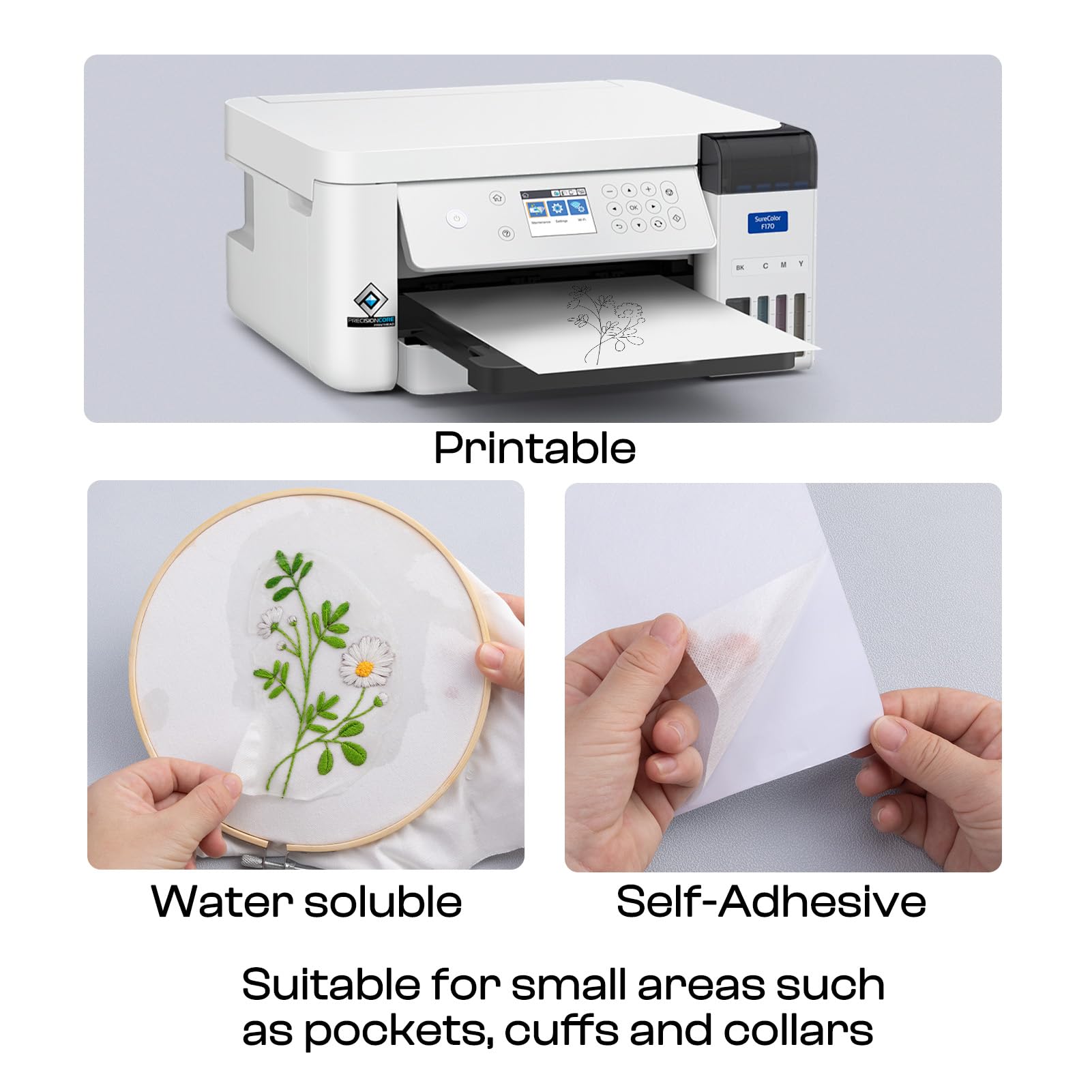 - Water Soluble Embroidery Stabilizer: The kit includes 2pcs self-adhesive water soluble embroidery stabilizer which can be printed on and easily adheres to various surfaces, making it suitable for holding small areas such as pockets, cuffs, and collars