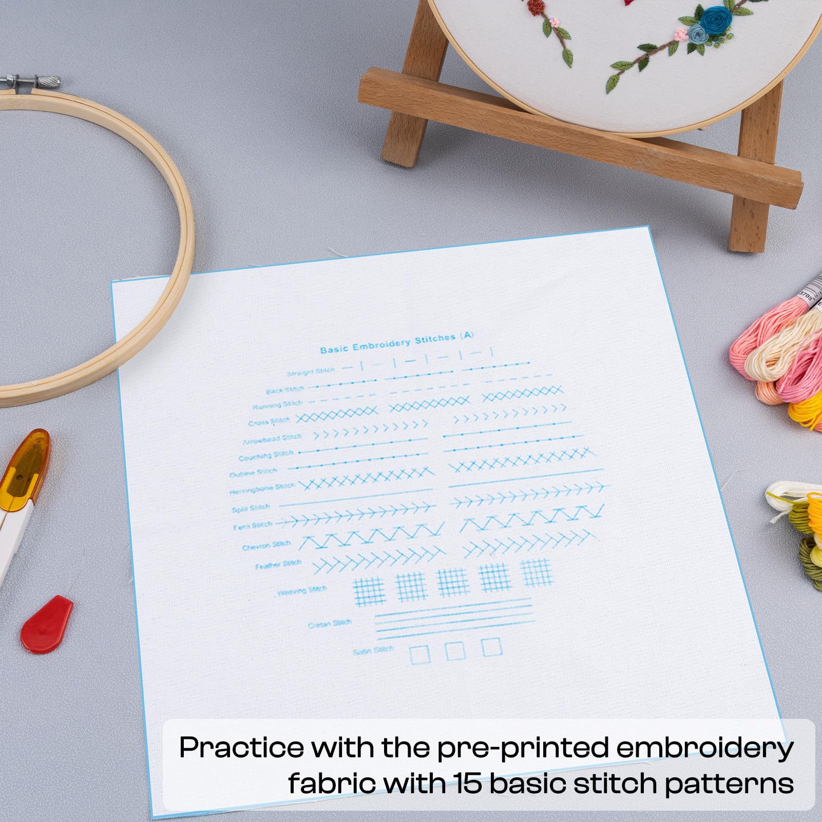 - Practice Fabric: This kit provides one pre-printed fabric featuring 15 basic stitch patterns and blank embroidery practice fabric, convenient for beginners to learn and practice embroidery