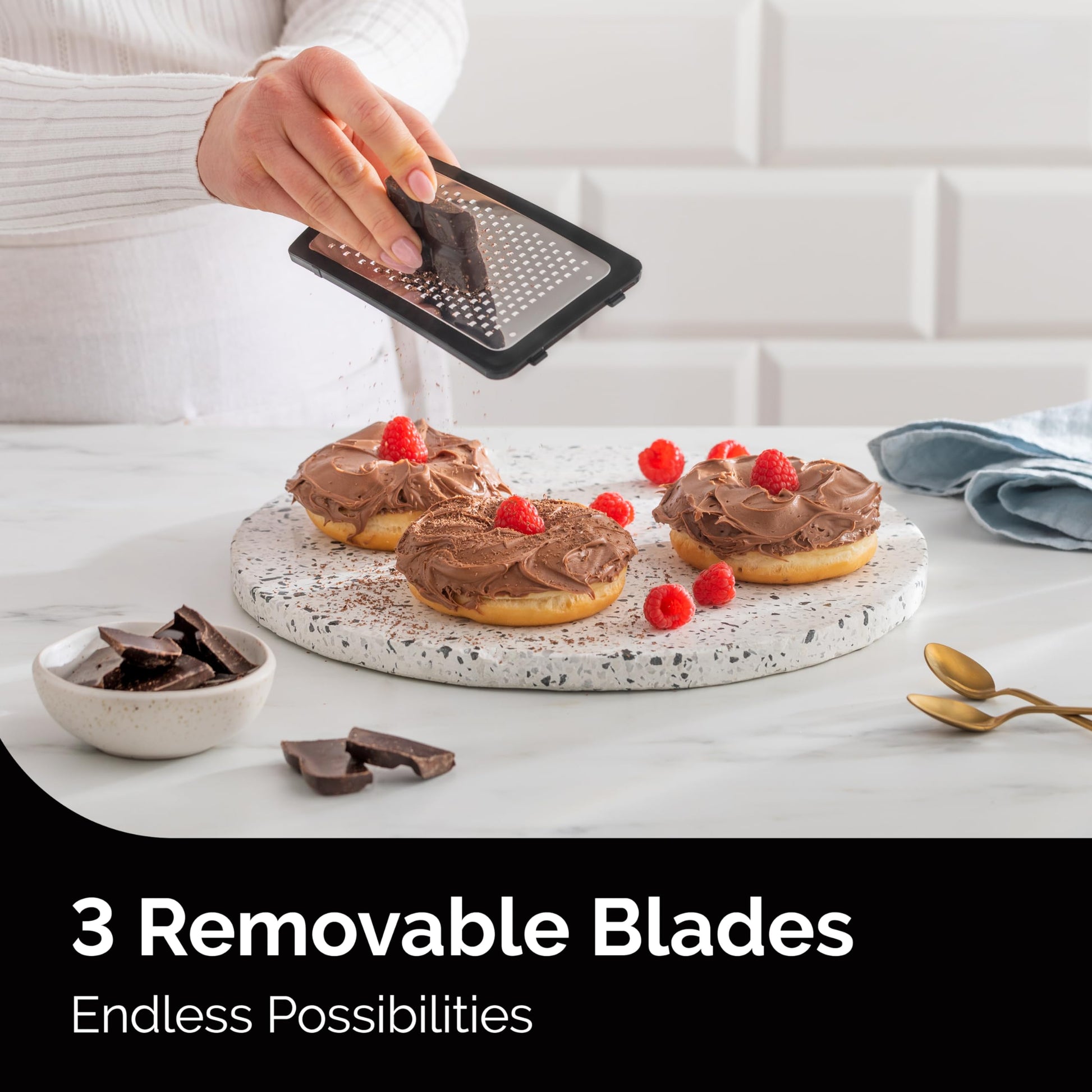 - Effortless Blade Switching. This kitchen grater offers 3 different grating surfaces: coarse, medium, and fine. Switching between surfaces is zero-hassle, with no need for multiple different graters. The compact design fits conveniently into drawers and saves you kitchen space.