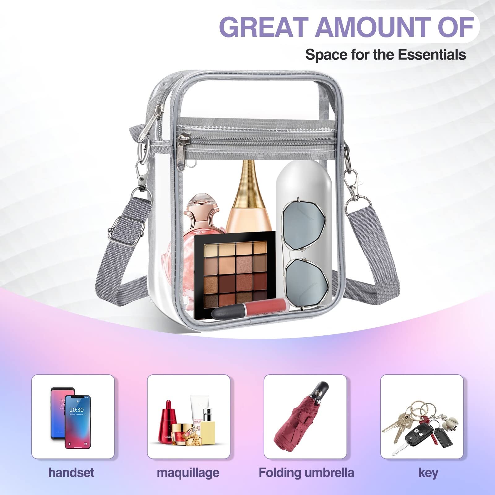 - ✅【Perfect Size】Clear crossbody bag medium size 8.7" H x 6.7" L x 2.5" W for carrying to put phone, wallet, cosmetics, perfume, sunglasses etc. Clear bags for women men use human design with front pocket great for small items like tickets, keys, cash, cards, you won't have to scramble at the last minute to find one.