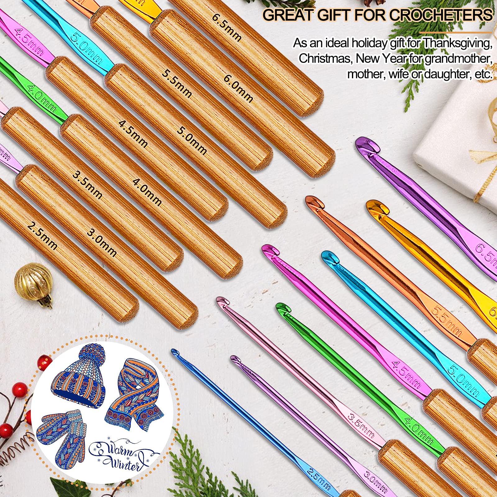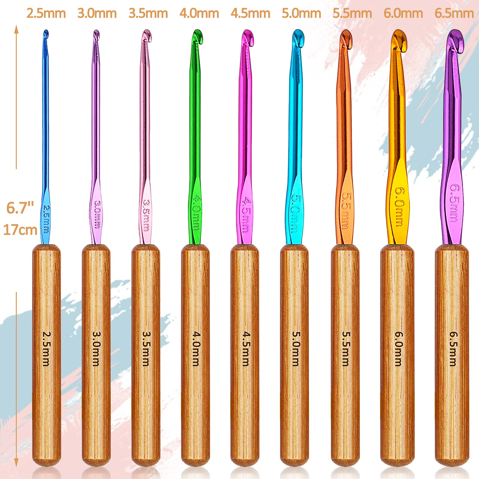 - 【COMPLETE CROCHET KIT FOR BEGINNERS】9 pieces crochet hook set include various popular sizes of 2.5 mm - 6.5 mm. The size is on the multicolor aluminum needle part, so it doesn’t rub off and can be distinguished by color. This ergonomic crochet kit (6.7''/17 cm) is longer than the standard size.