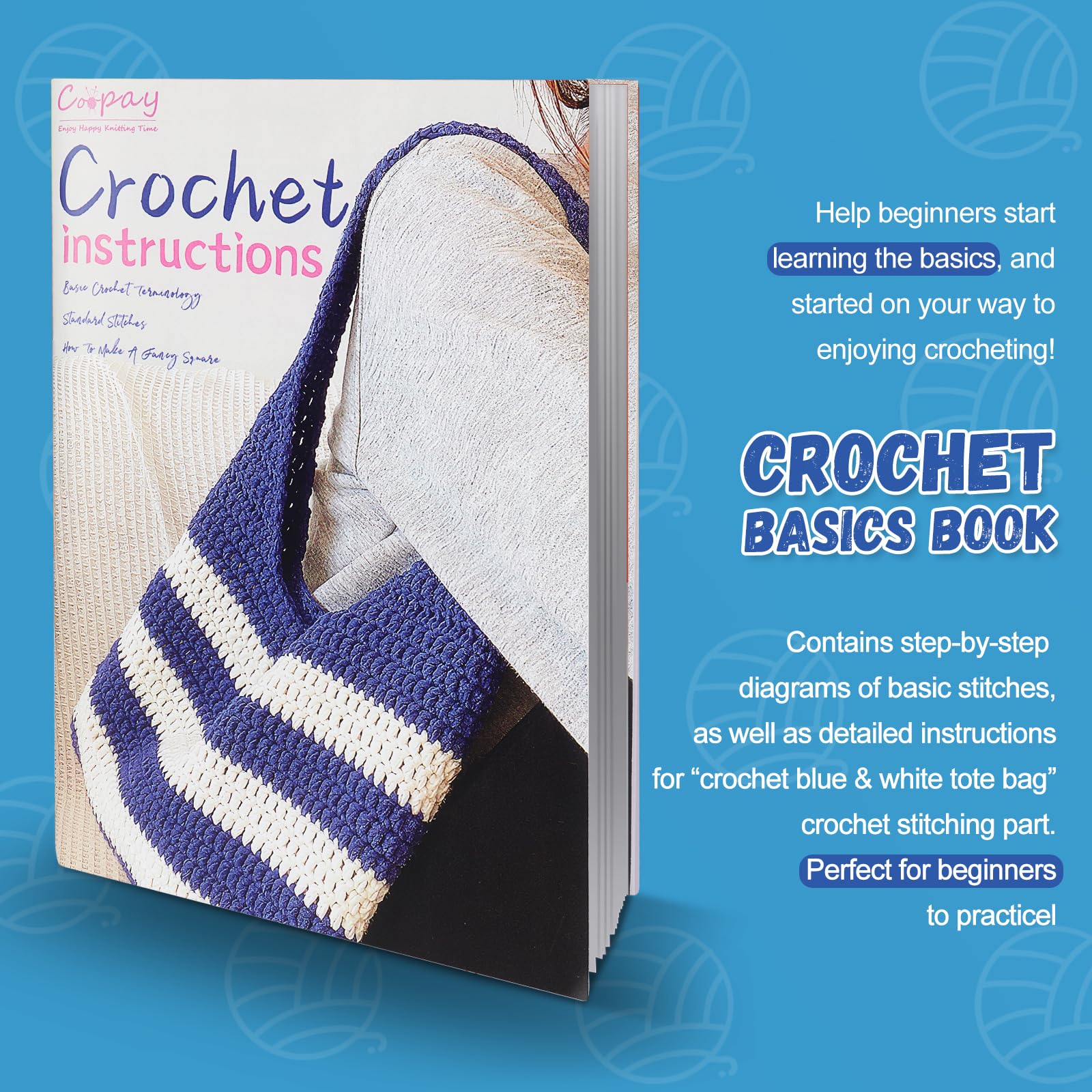- [Beginners Crochet Kit for Tote Bag with Instruction] Coopay crochet kit for beginners adults contains a detailed beginner's instruction book, which includes basic knowledge of crochet and stitches. The specific operation steps have pictures and text descriptions, which are clear at a glance. If you want to learn to crochet something new but have no experience, this crochet beginners kit for handbag is a great crochet starter set that is simple and easy to follow.