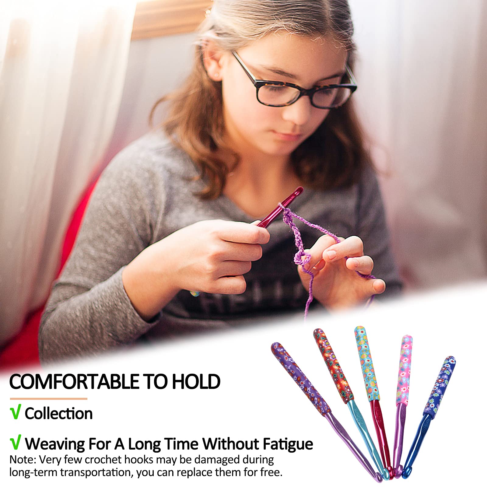 - ❤️[Pretty & Smooth Aluminum Hook, Easily Identify Size] The crochet grip pattern adopts beautiful flower series patterns. Our crochet hook set have smooth hook, which don't catch on the yarn or splitting the yarn. Making the crocheting process more efficient and comfortable. Multicolor crochet hooks needles, different colors match different knitting needles size. Every hook is marked with numbers and Letter, so you’ll never be confused