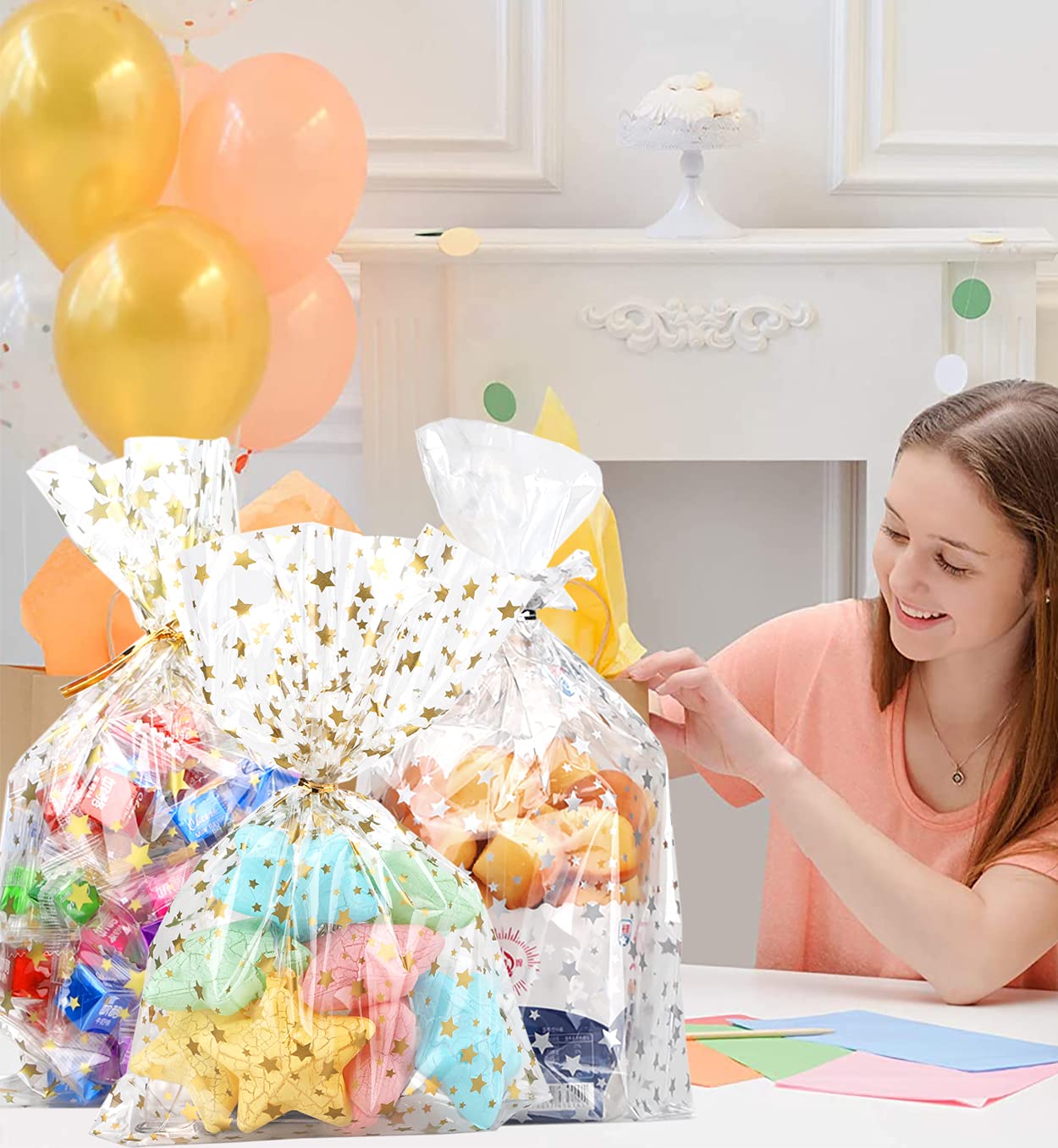 - 【WIDE APPLICATION】:Star cello plastic treat gift bags great for small businesses, weddings, parties, birthdays, holiday events, or any other special occasion to pack your gifts, candies, cookies chocolates, biscuits, snacks, cakes, soap, toys, crafts, and other accessories...