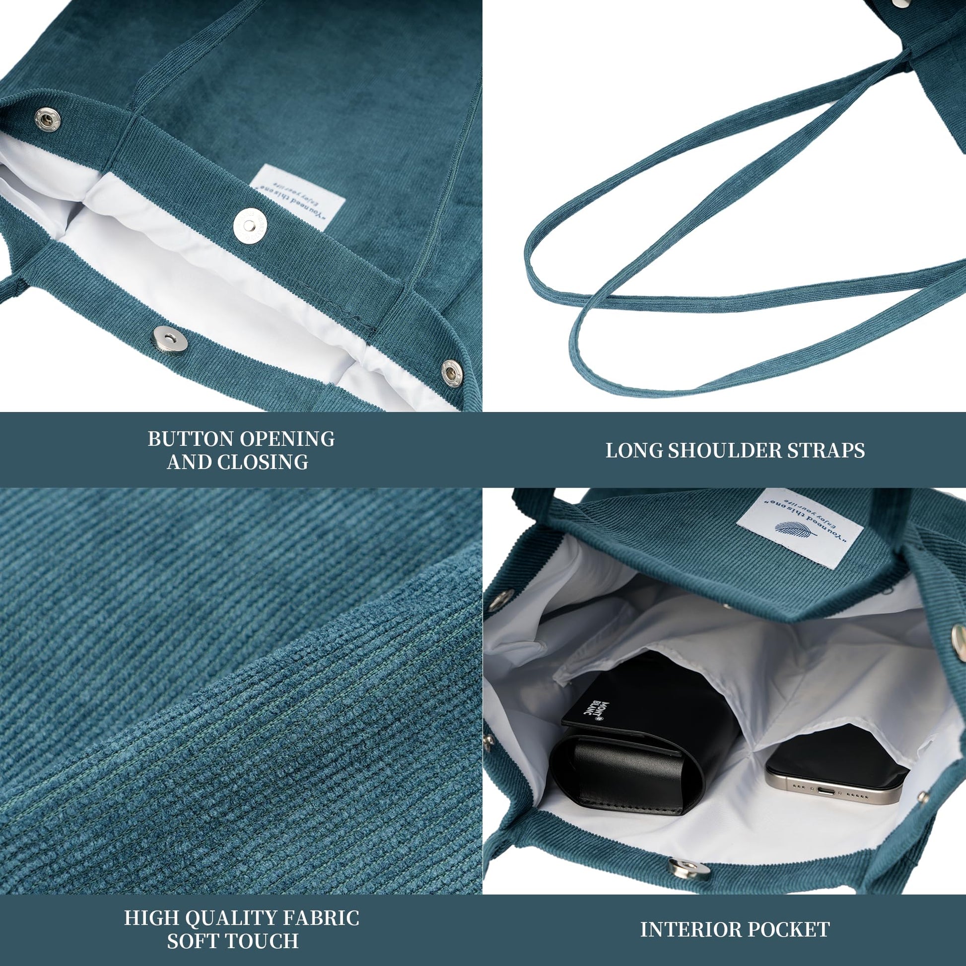 Corduroy Tote Bag Cute Tote Bags for Women Shoulder Bag with Inner Pocket for Work Beach Travel and Shopping Grocery (Blue-green)