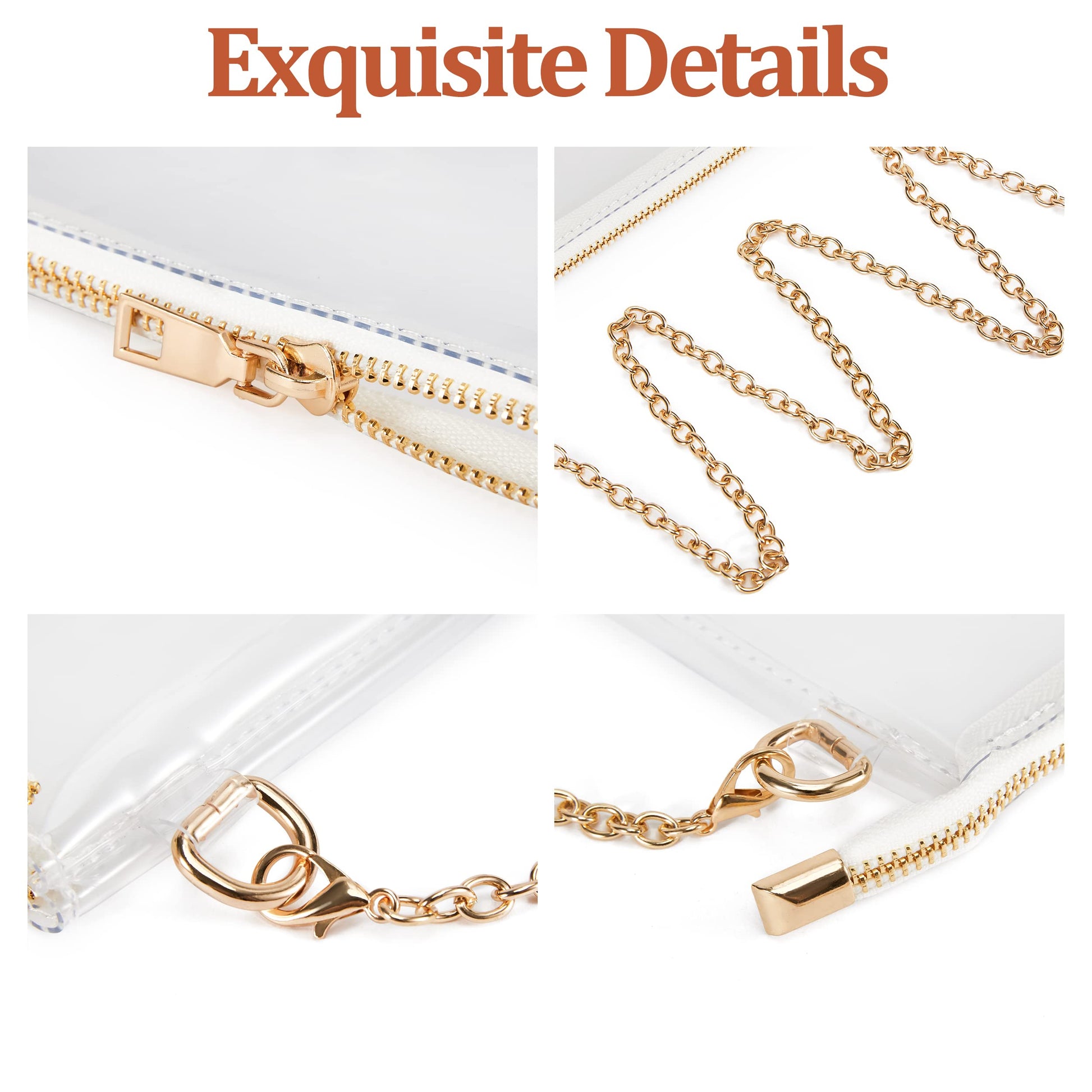 - ADJUSTABLE REMOVABLE CHAIN: The clear bag adjust the length by snapping the chain or passing the chain through the hole twice, carry it as a handbag, shoulder bag or crossbody bag to suit various event and outfit.