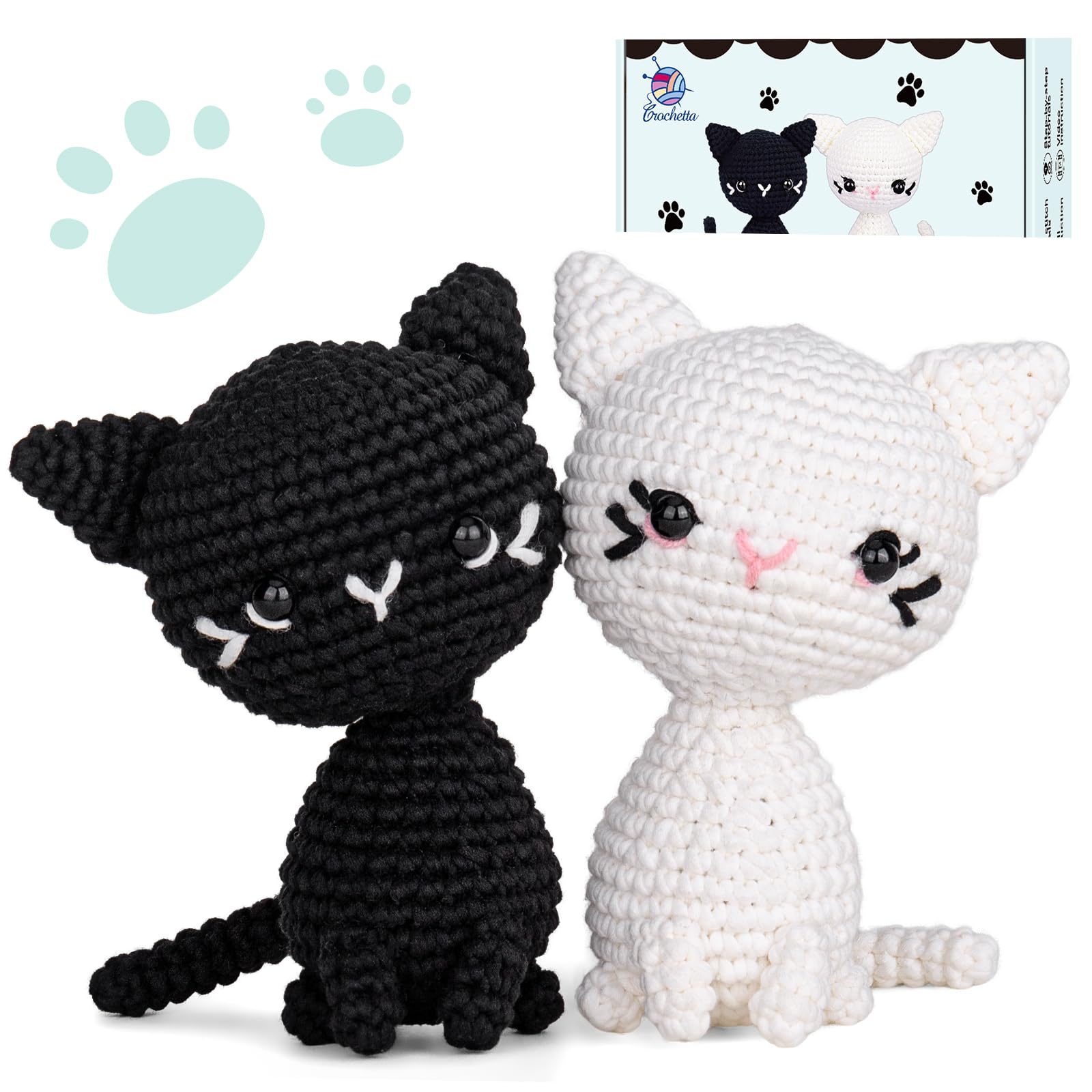 - All-In-One Crochet Starter Kit from CROCHETTA includes everything needed to start: 3 different colored yarns, ample stuffing, 1 needle, 4 eyes, 4 stitch markers, 2 ergonomic crochet hooks, 1 pair of scissors, 1 crochet kitty pattern manual, and 1 beginner's basic crochet manual
