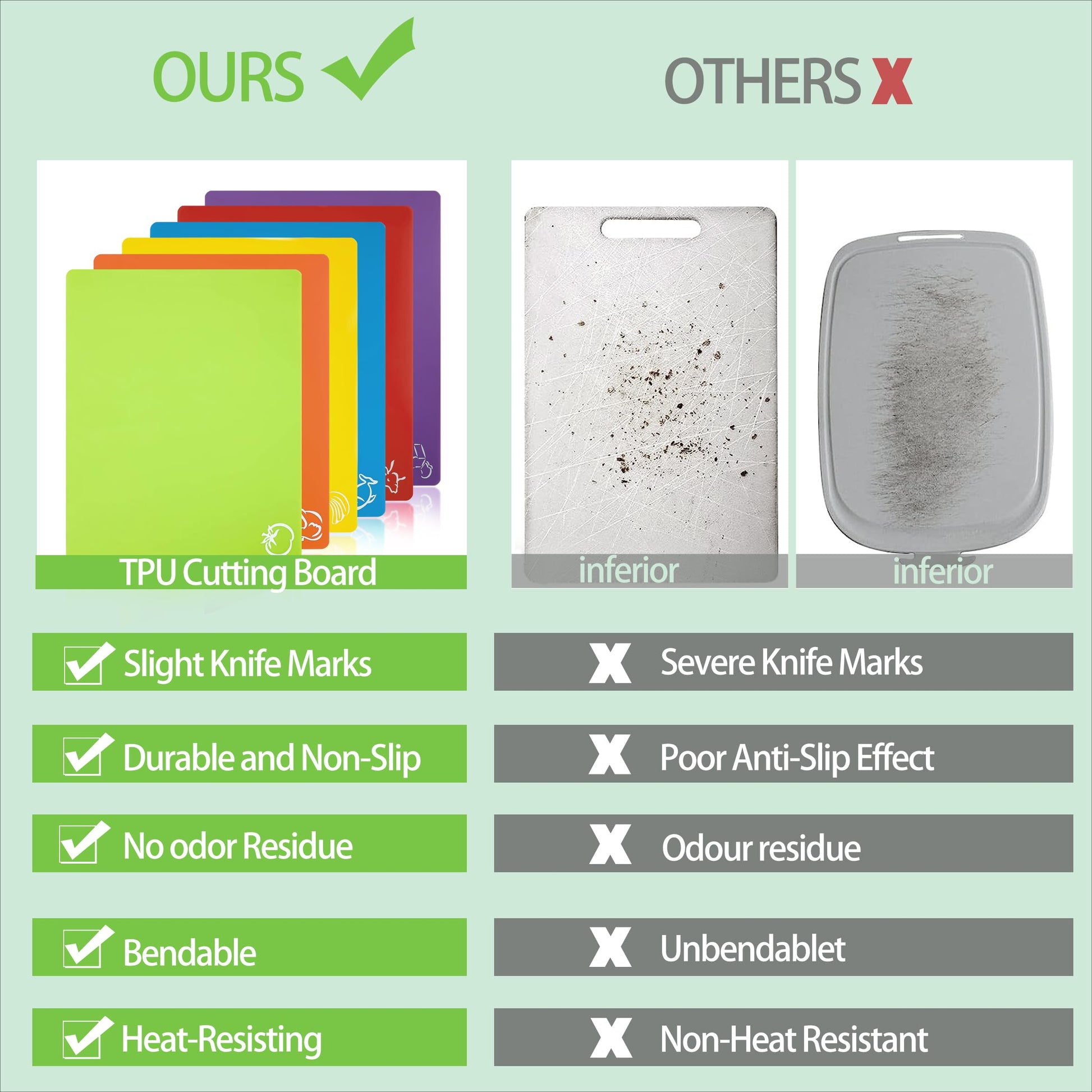 - MULTICOLOR CUTTING BOARDS:A Set of 6 Color plastic cutting boards is suitable for different food. These cutting mats are helpful to keep the food's taste original and avoid mixing food flavours when you are cutting food. Give your family healthier meals every day.