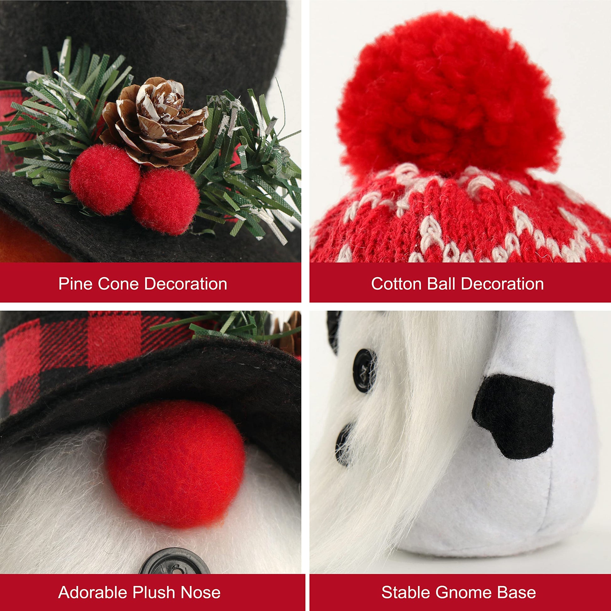- Adorable Design - Handcrafted. The Gnomes feature long plush white beard&hair and red plush nose. Snowman shape,snow shovel ,red and black plaid scarf , red bow tie hair rope add festive atmosphere. The size is about 7.3 inches tall from hat top to bottom, perfect addition to the Christmas collection.