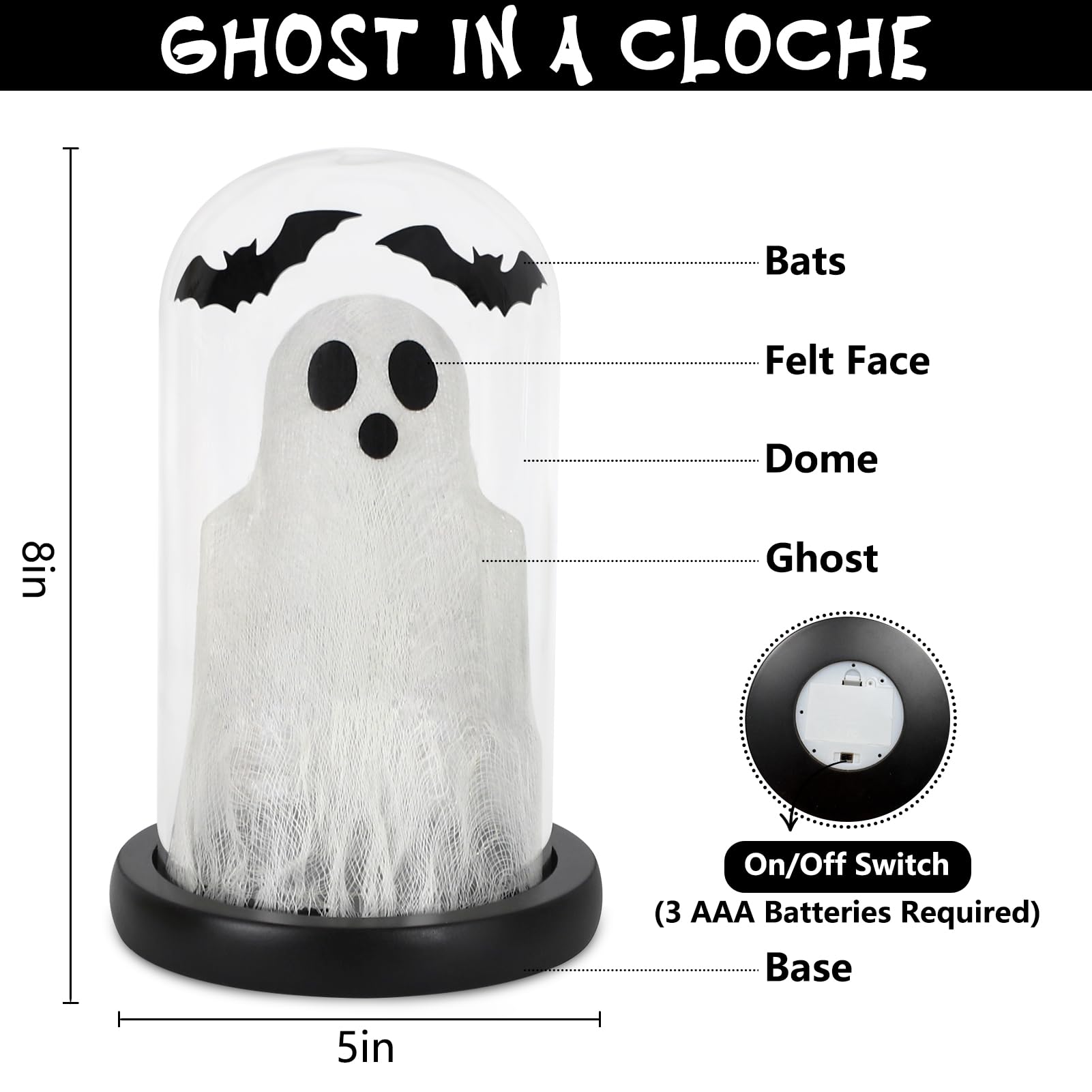 - High Quality Materials: This illuminated ghost decor cloche features a durable high-borosilicate glass dome and a sturdy ABS base. Powered by 3 AAA batteries (not included).
