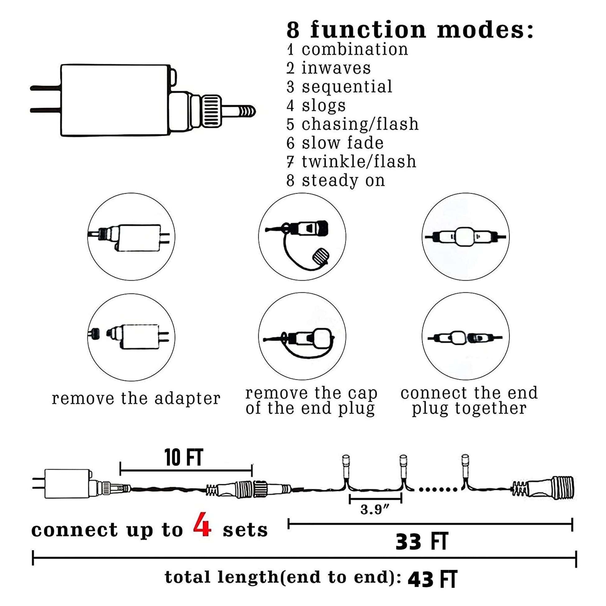 - 8 Lighting Modes Christmas Lights: 8 Modes (combination, in wave, sequential, slo-glo, chasing/flash, slow fade, twinkle/flash, and steady on). You could use different modes of the 100 LED lights according to different occasions, light up a unique outdoor & indoor illuminated backdrop for your vivid and funny decorations.