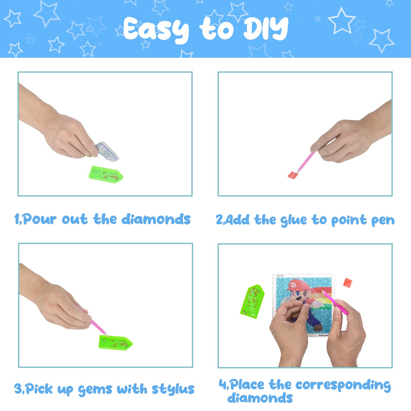 - Kids Diamond Painting with All You Need - Package includes 4 pre-printed canvas, 4 diamond painting stylus, 4 tray, 4 wax square, 1000+ colorful gems. 4 pack diamond art tools can allow several kids to DIY their art projects together.