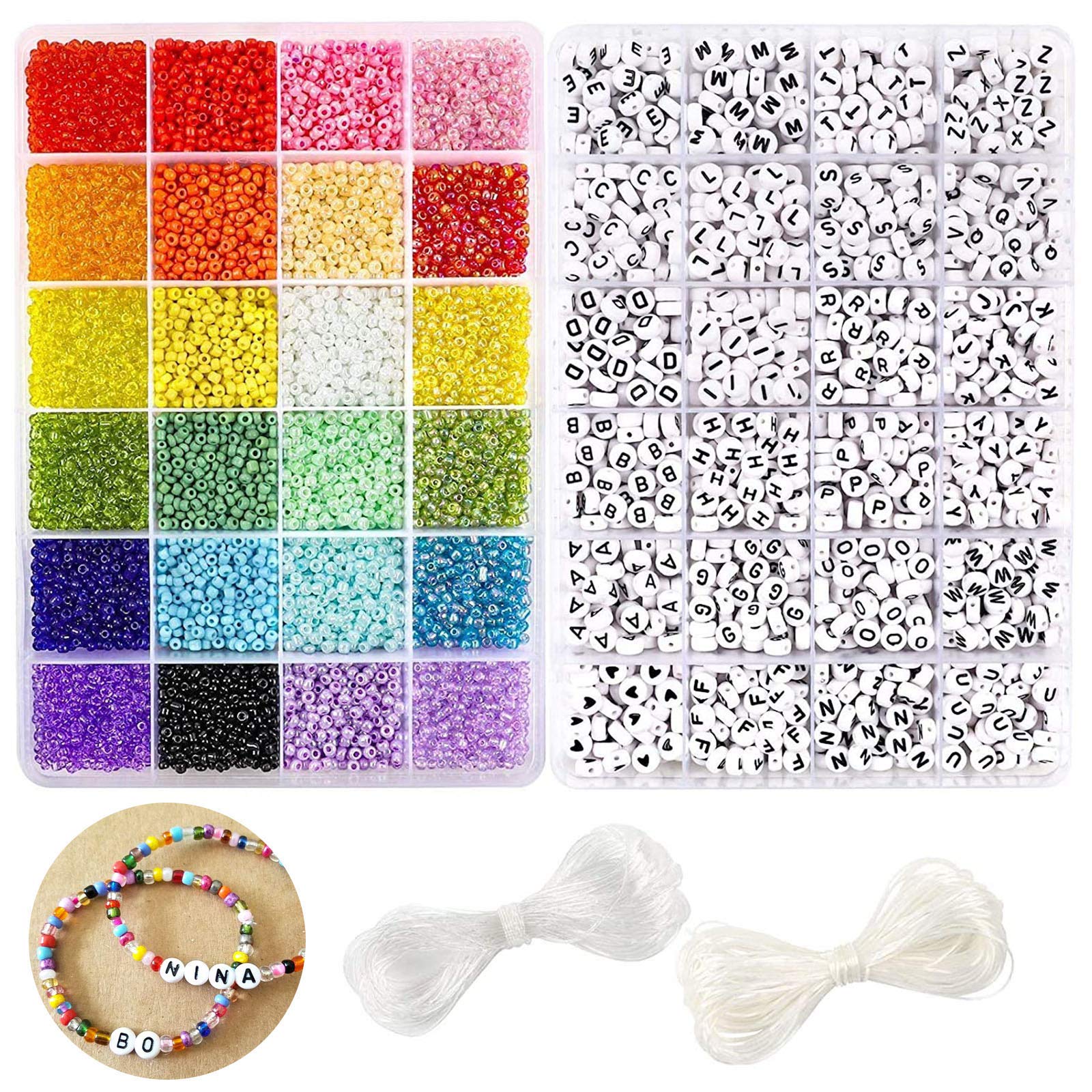 DICOBD 12000pcs 3mm Glass Seed Beads for Bracelets Making Kit with Letter Alphabet Beads, Friendship Bracelet Kits 8/0 Craft Bead for Jewelry Making Necklaces and Key Chains with 2 Rolls of Cord