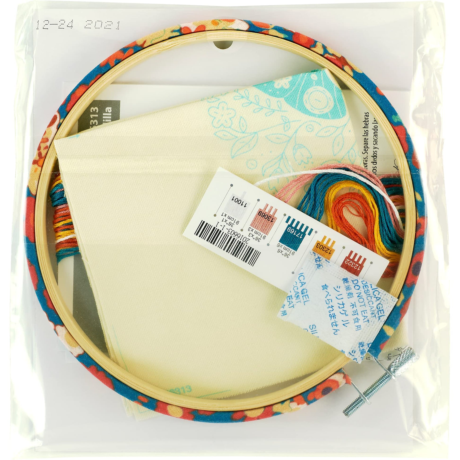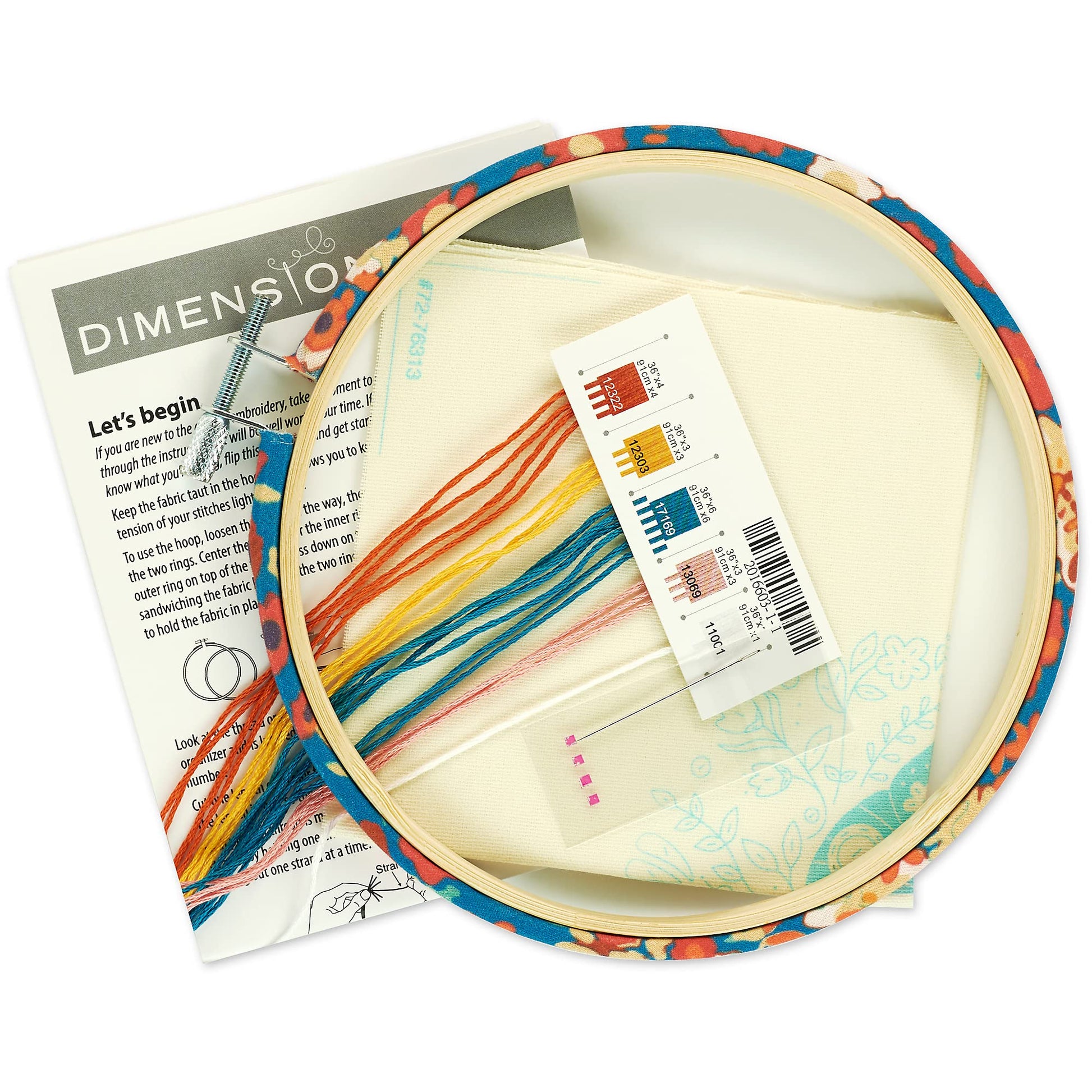 - Dimensions embroidery kit contains presorted thread, printed fabric, 6-inch fabric-covered bamboo hoop, needle, and instructions