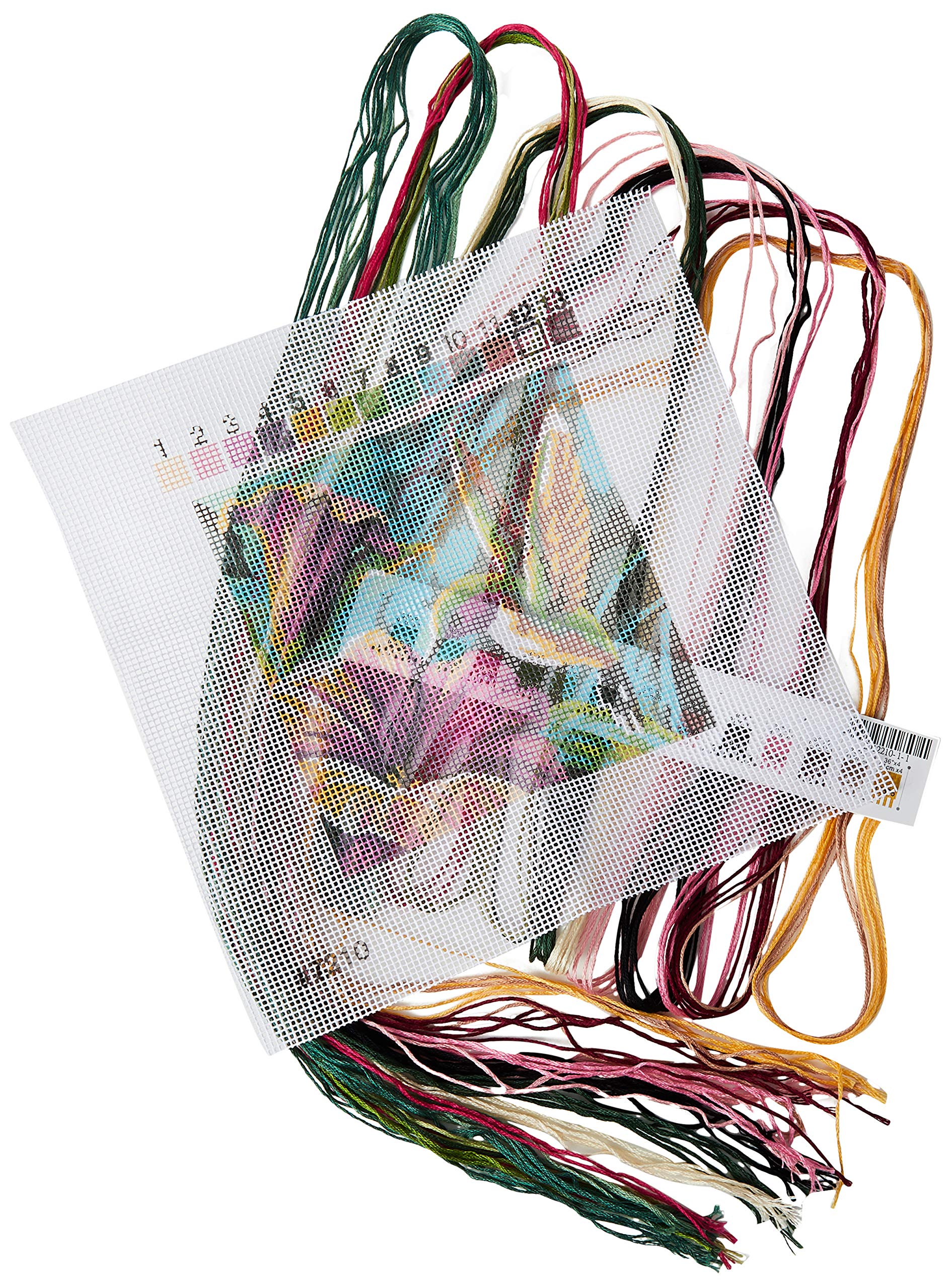 - Includes cotton thread, needle, full color printed design on size 14 mesh canvas, and directions