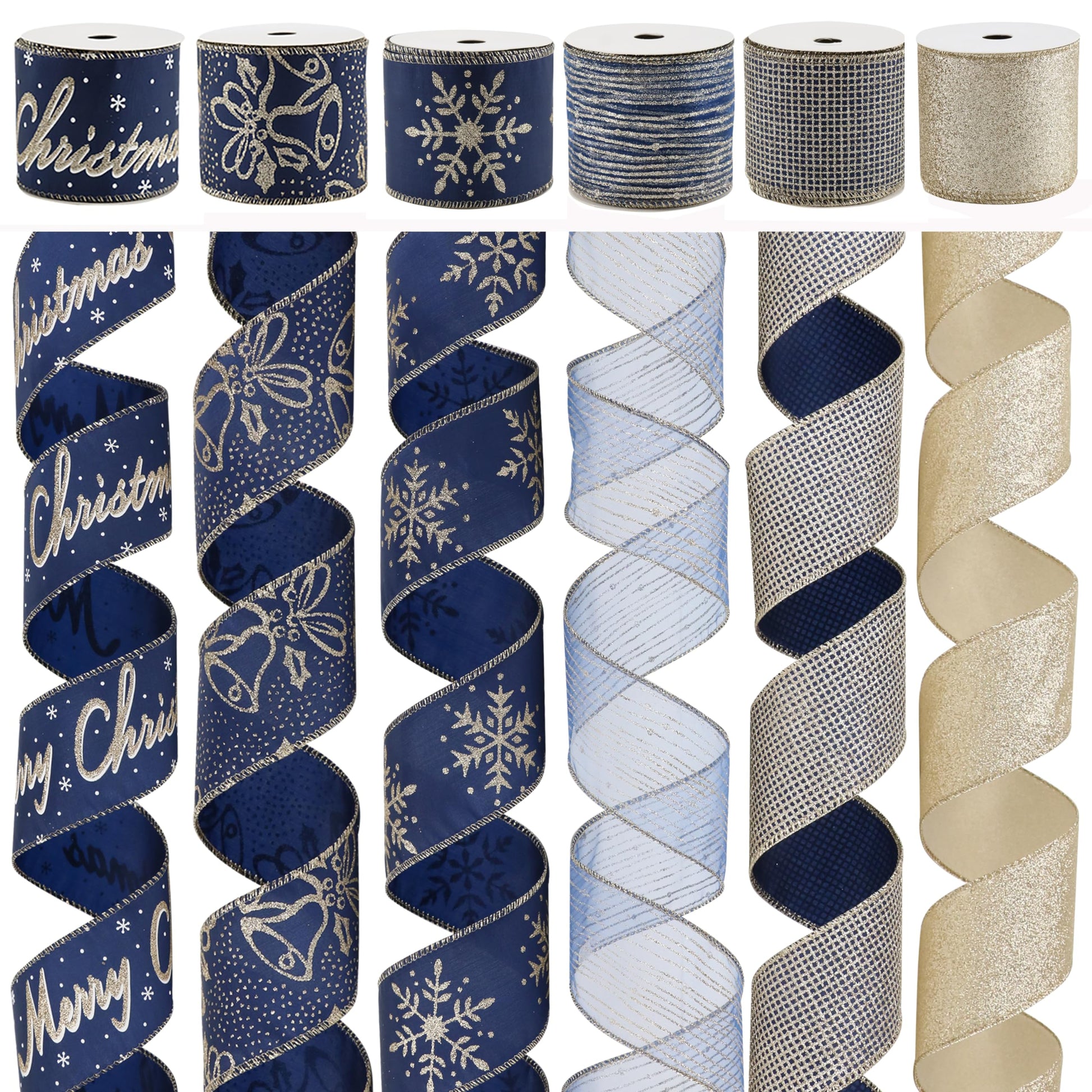 - [6 ROLLS PACKAGE] This Navy blue and champagne gold christmas ribbon set includes 6 roll with different looks in paper spools.The assortment includes full champagne glitter wired ribbon, gold glitter snowflake ribbon, champagne glitter jungle bell print on navy blue satin ribbon, navy twinkling stripe organza sheer ribbon,merry christmas banner navy ribbon,square lattice glitter navy wired ribbon, which is dedicate and exquisite, simple but well matched for your christmas decorations.