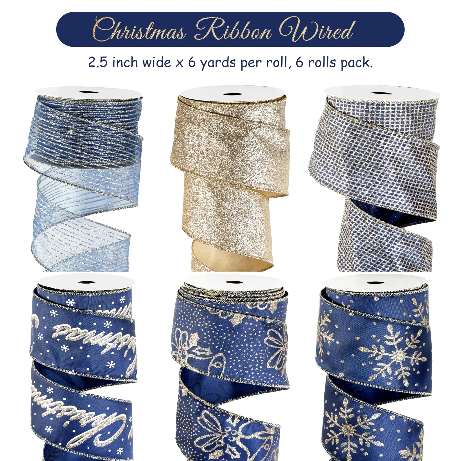 - [SIZE] you will receive 6 rolls of navy blue / champagne gold christmas ribbons by 2.5 inch wide, 6 yards long each roll, total 36 yards, this ample width and length with most versatile and eye-catching to your christmas home decor,christmas trees, garlands and wreaths, gift wrapping.