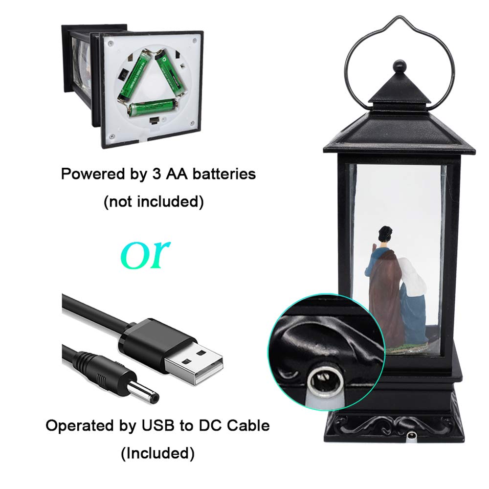 - Power Supply: Included USB cable allows you operate the snow globe lantern without batteries. You can also operate it with 3 AA batteries (not included), so that you can place them anywhere you want to display with your Christmas decorations