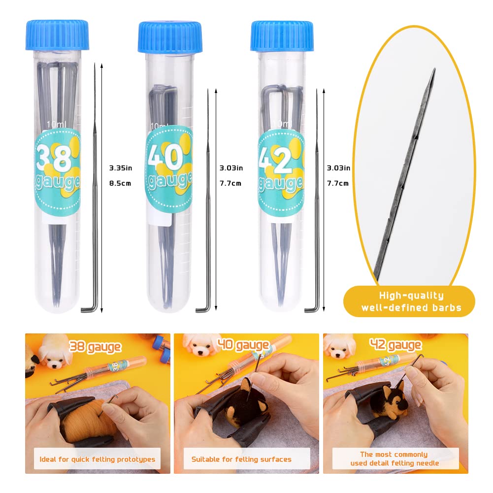 - 【24 Pieces of Felt Needles】Our needle felt kits provide 3 different sizes of felt needles. 38 gauge quickly bond wool together for early felting, 40 gauge for felting surface details, and 42 gauge for the finishing stage. The different felt needles are packaged in needle bottles with cute size labels for easy identification. Wipe the protective oil from the felting needles with a small rag before use.