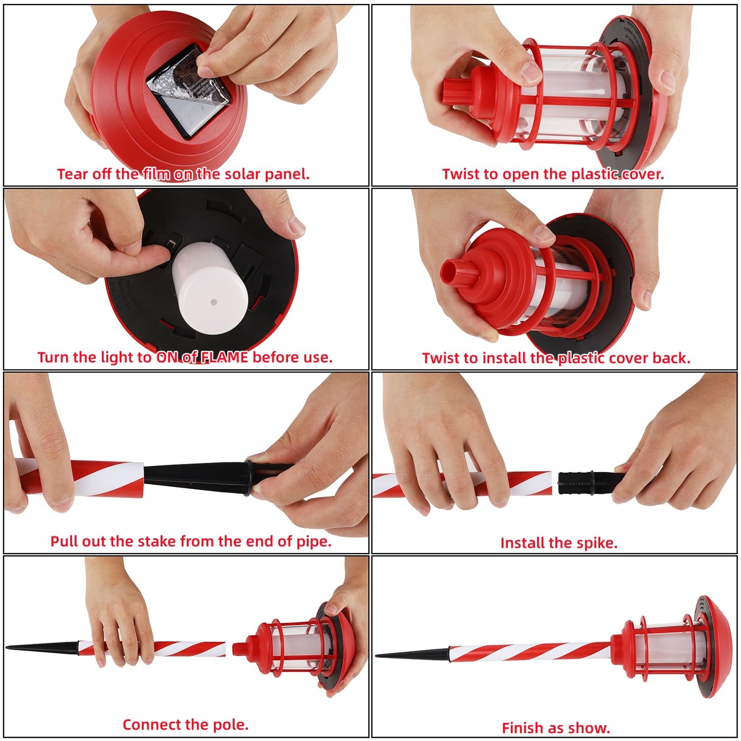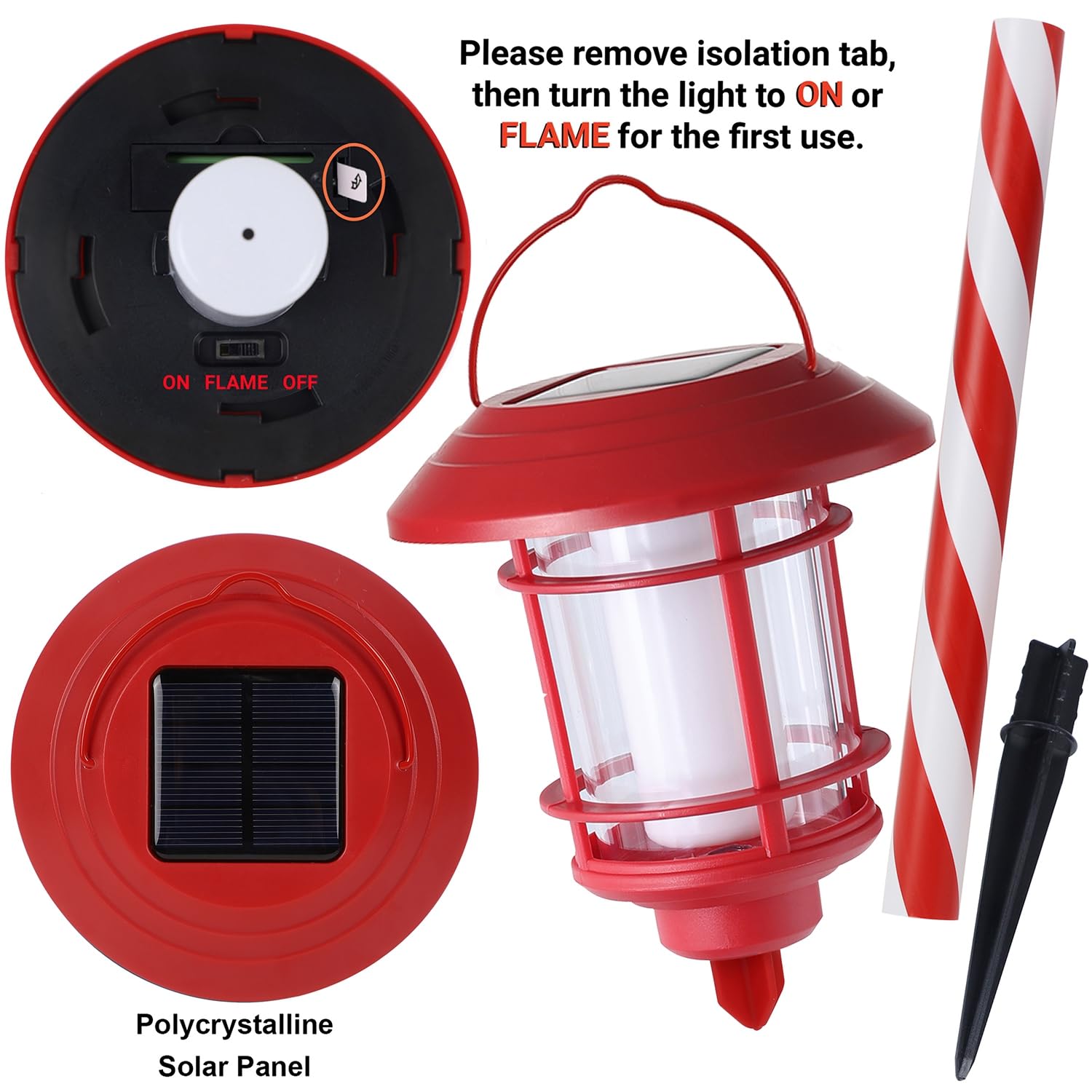 - FLICKERING FLAME CANDY CANE TORCH LIGHTS: Connect the light, pole and stake(inside the pole), insert the stakes into the soft soil or ground where there has direct sunlight. Solar LED flickering flameless garden candy cane pathway maker lights, add a 360 degree viewing angle illuminate charming to your garden, decorate your fence, deck, porch or yard. Size with Stake- 4.9 x 4.9 x 19.1 inches
