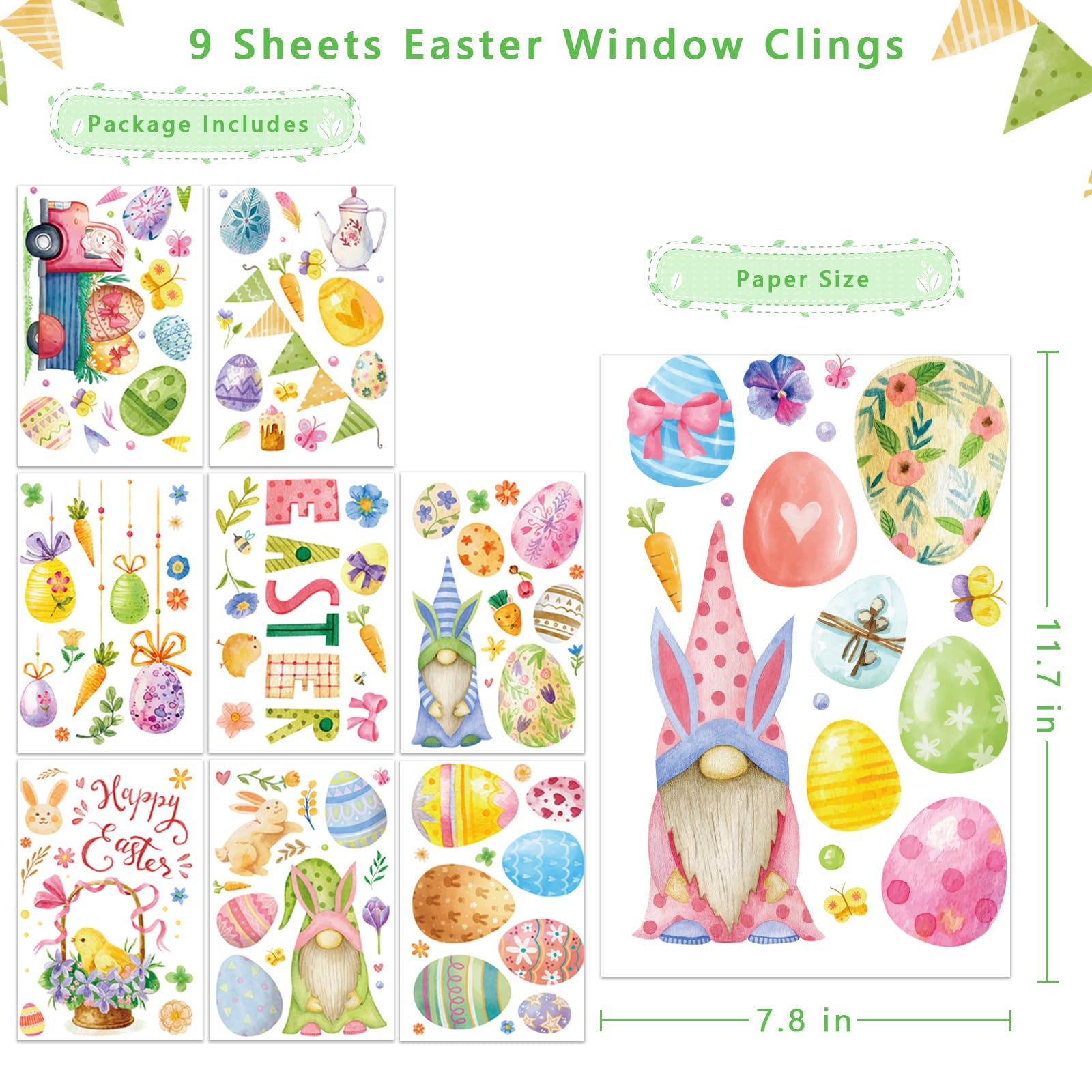 Easter Decorations Window Clings Decals Decor, 9 Sheets Large Easter Eggs Flowers Bunny Party Supplies Gifts, Double Sided Spring Window Clings Decorations for Kids School Home Office