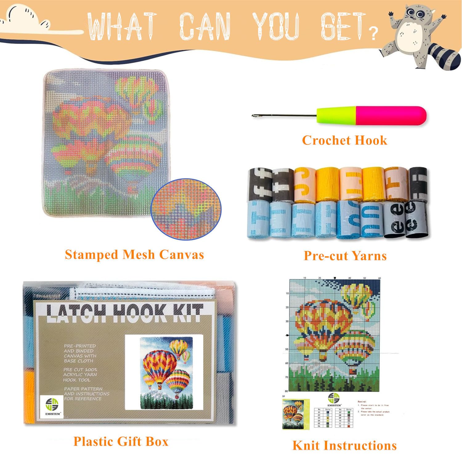 Latch Hook Kits for Adults - DIY Latch Hook Rug Kits for Kids, Crochet Kit for Beginners, Rug Making Kits with Printed Canvas, Gift Packaging.(Colorful Hot Air Balloons, 20x15)