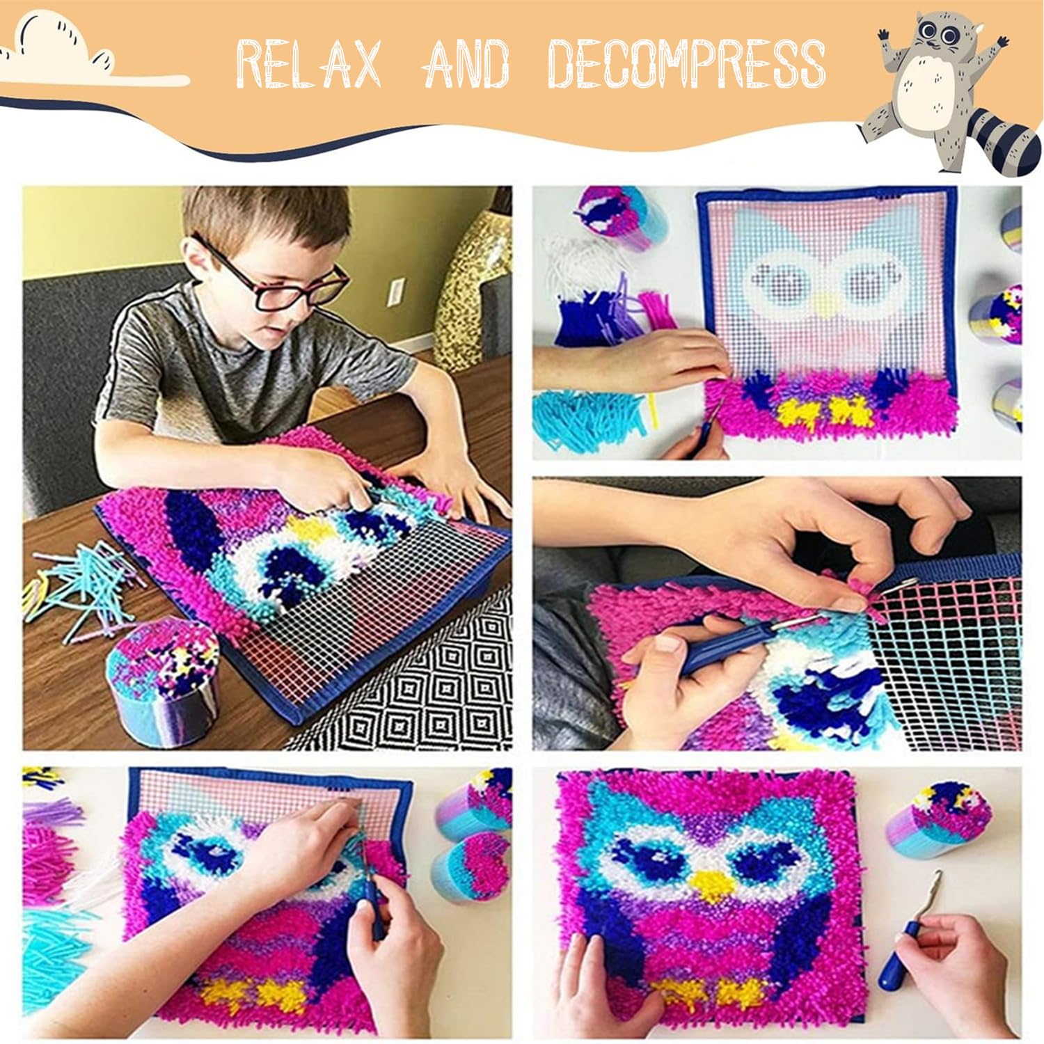 - BEGINNERS FRIENDLY: Unlike others knitting kit with white background canvas that is difficult to finish, THIS LATCH HOOK KIT HAS A COLORFUL PATTERN, THE PATTERN IS PRINTED ON THE CANVAS, you can clearly know where each color yarn goes, rug making kits is suitable for kid and adult beginner and crotchet enthusiasts.
