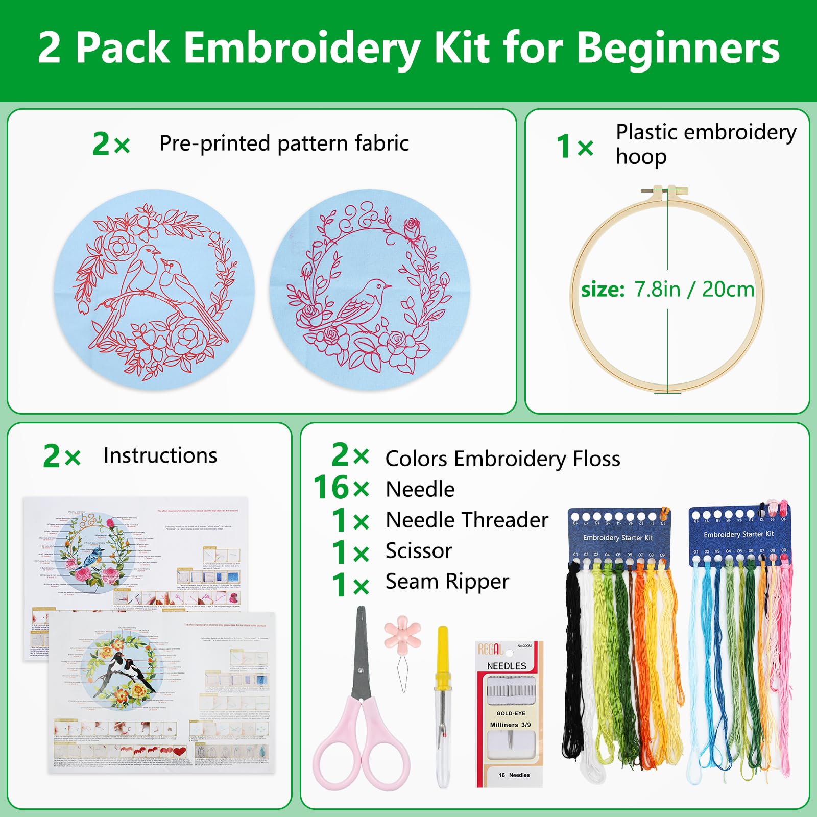 Embroidery Kit for Beginners Adults,Bird-Hummingbird Embroidery Kit Cross Stitch Kits for Beginner Easy to Learn Stitches Instruction Video Stamped Embroidery Pattern Flowers B2-2 Sets