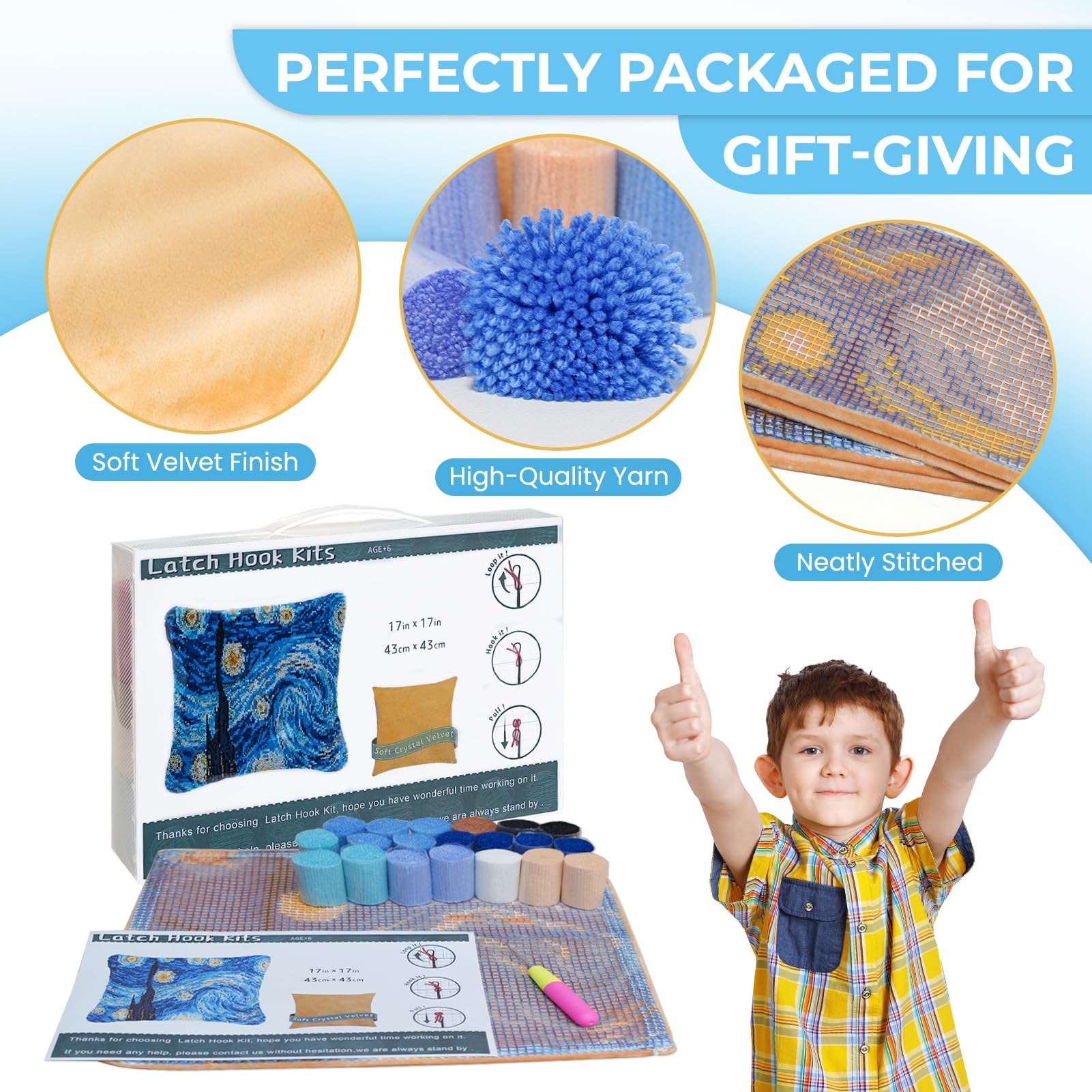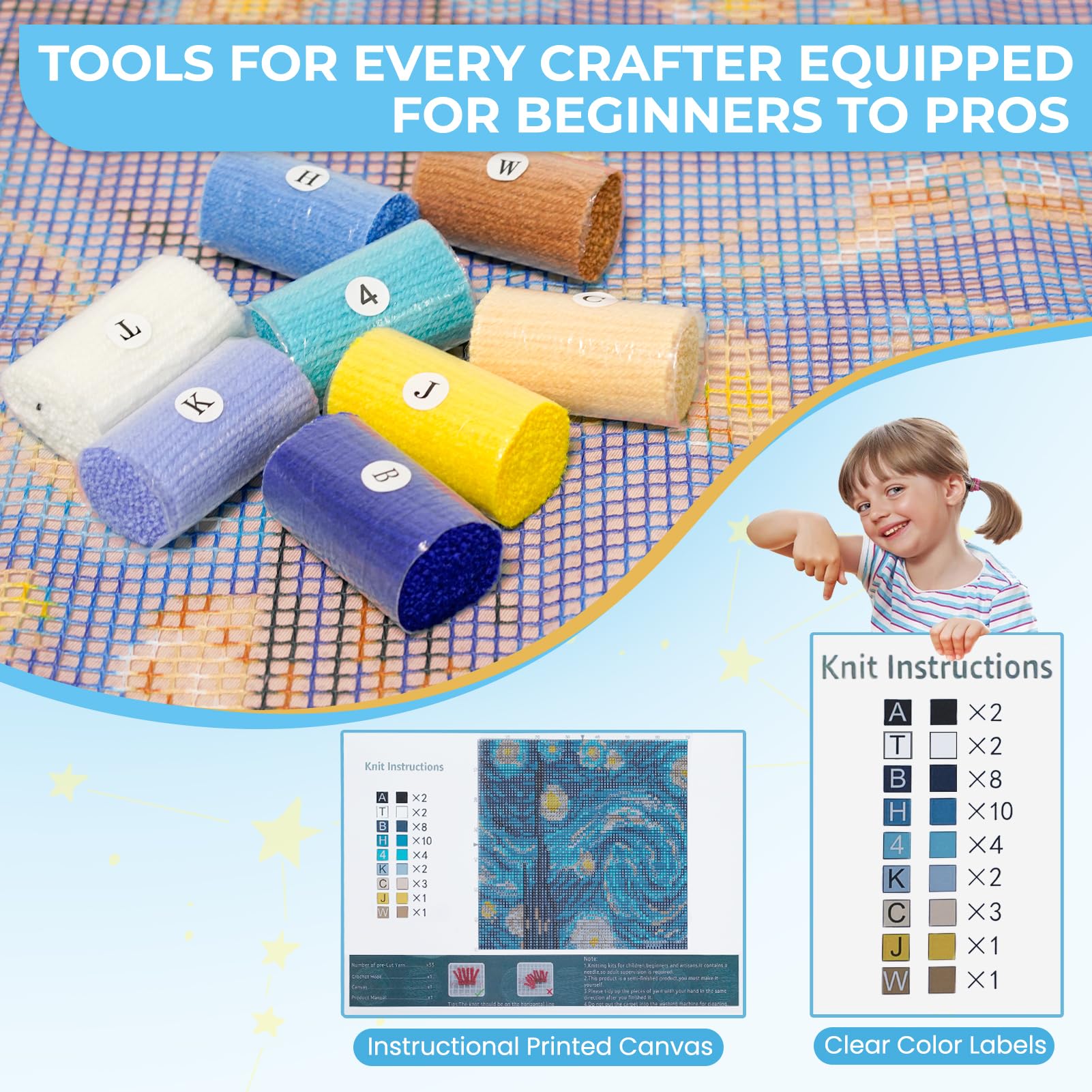 - Easy to Follow Instructions: The latch hook pillow kits for beginner feature a vibrant, pre-printed Starry Sky pattern on the canvas. Clear instructions and color-coded guides make it easy for beginners and to create a stunning pillowcase