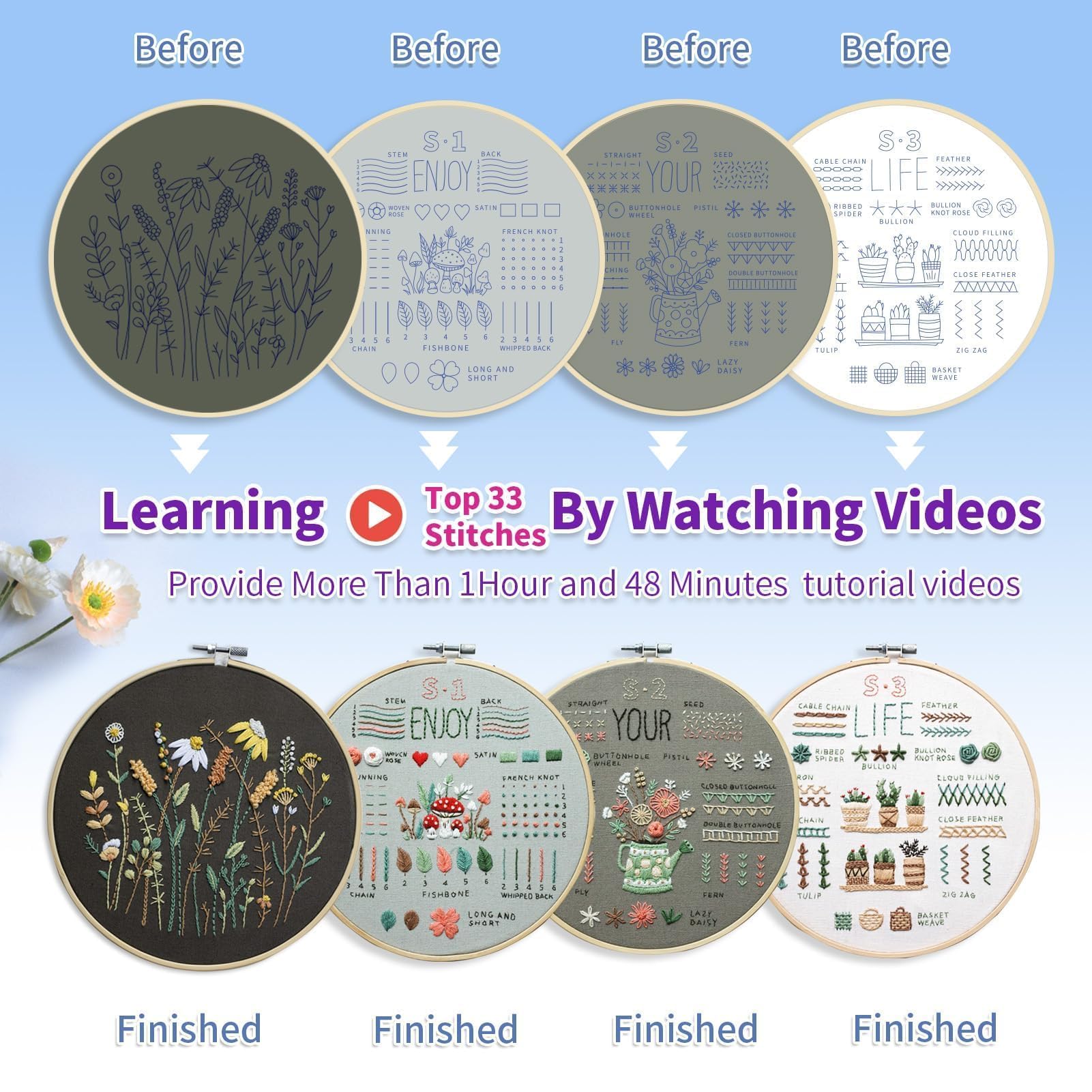 ETSPIL Embroidery Kit for Beginners, 4 Floral Patterns, Learn 33 Stitches, Pre-Printed Fabric, 7.8-Inch Hoop, Colored Threads and Needles, Easy Video Guide, DIY Hand Sewing Gift for Adults and Teens